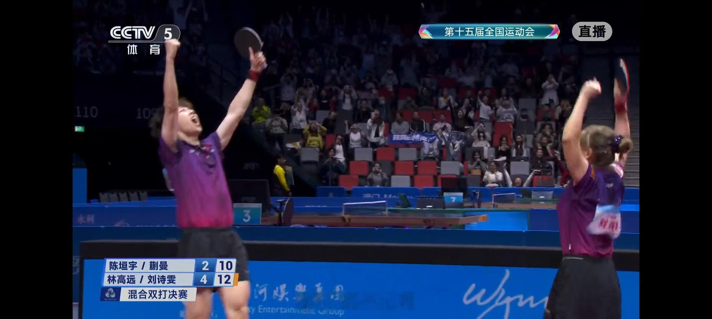 乒乓球混双决赛林高远/刘诗雯(广东队) 4-2 陈垣宇/蒯曼(江苏队)【13-15,8-11,11-8,11-8,11-8,12-10】,刘诗雯卫冕全运会乒乓球混双冠军!
