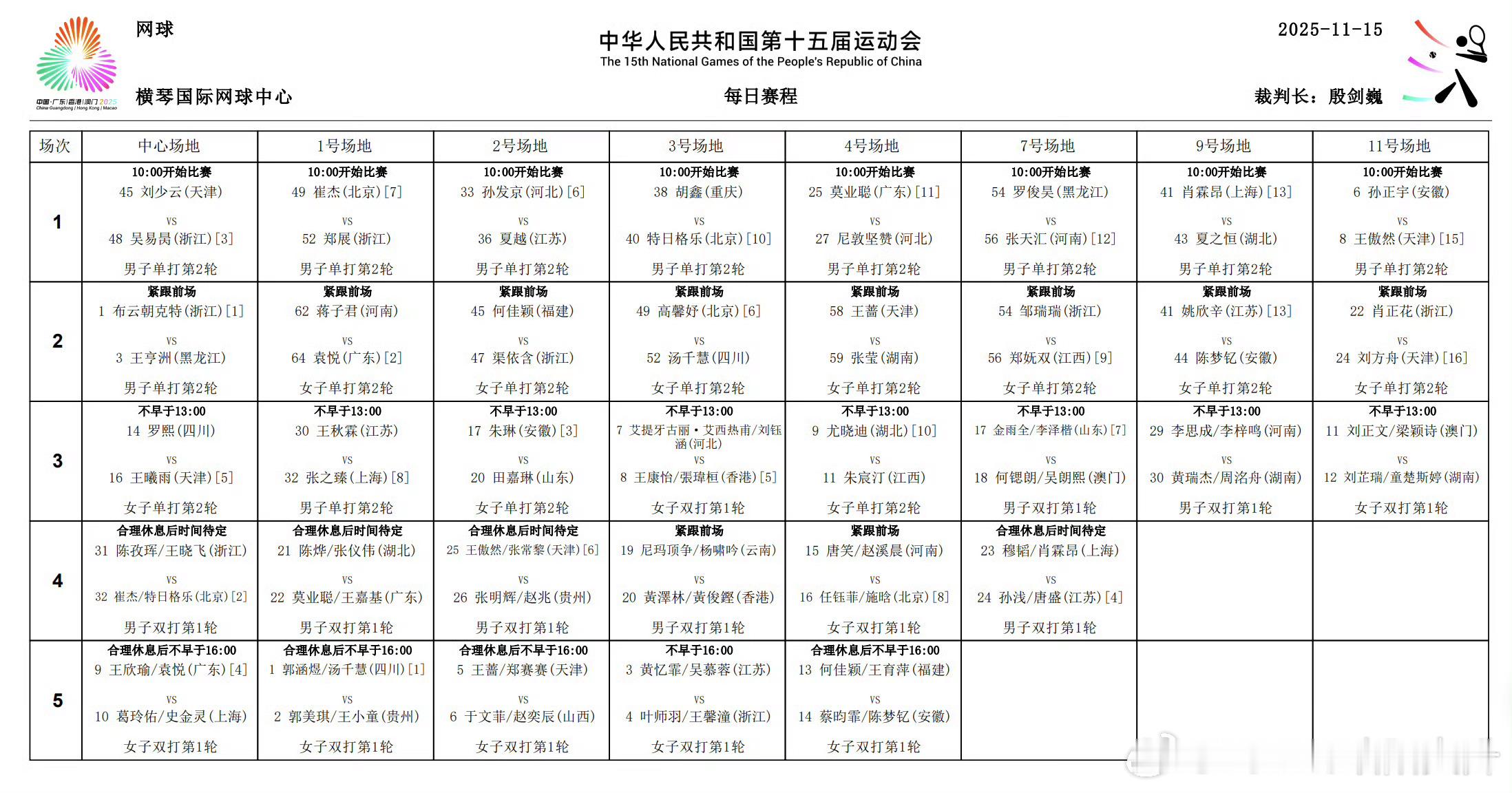 网球11月15日赛程中心场有直播 其他的没有10:00吴易昺vs刘少云随后布云朝克特随后王曦雨最后一场王欣瑜/袁悦袁悦、张之臻被安排在1号球场朱琳、王蔷等名将也将出战 丨