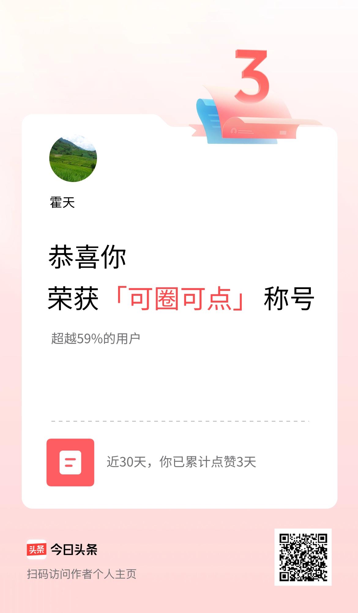 我在头条30天内点赞打卡3天,获得“可圈可点”称号