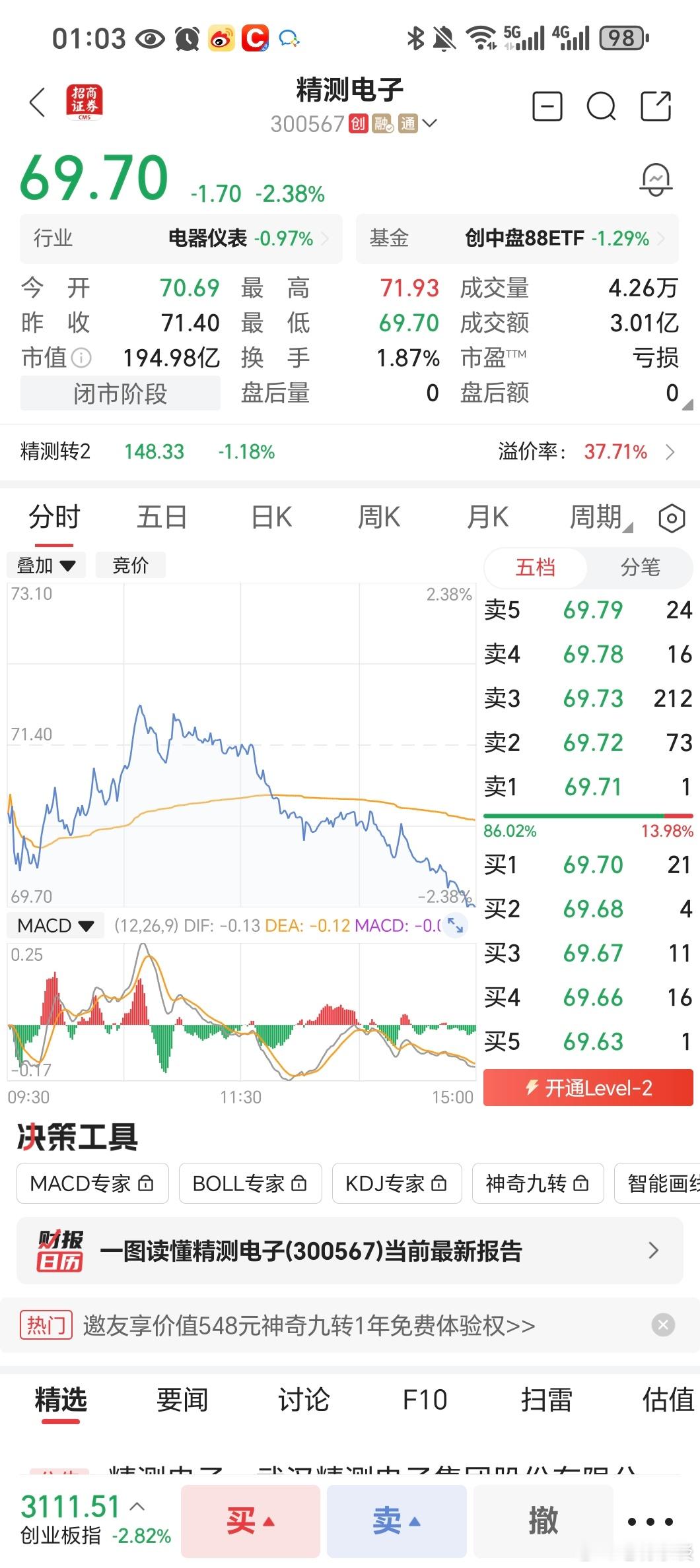 🔍 精测电子盘中表现2025年11月14日,精测电子(300567)延续调整态势,收盘报69.70元,下跌2.38%,表现弱于电器仪表板块(-0.97%)和创业板指(-2.82%)。股价全天震荡下行,最高仅触及71.93元,成交额3.01亿元,较前日继续萎缩,换手率1.87%。资金面上,近5日该股资金总体呈流出状态,共流出-1804.85万元。其可转债"精测转2"同步下跌1.18%,但转股溢价率进一步攀升至37.71%。📈 精测电子后续走势短期股价将考验69.70元支撑位。若失守,可能下探68.00-69.00元区间。不过,公司基本面具备韧性。2025年1-9月实现营业收入22.71亿元,同比增长24.04%;归母净利润1.00亿元,同比增长21.70%。核心动力半导体业务进入快速放量期,2025年上半年该业务收入同比大增146.44%,截至8月26日在手订单约18.2亿元,占公司整体订单50.5%。公司在14nm、7nm等先进制程检测设备领域已实现交付并获重复订单。机构普遍看好其国产替代逻辑与成长空间,近90天内多家机构给出"买入"或"增持"评级,华泰证券给予目标价101.1元。但当前估值偏高(机构预测2025年PE约78-93倍)及可转债高溢价率仍是短期制约。后续需观察股价能否在69元附近企稳并伴随量能重新放大。若半导体设备板块整体回暖且资金回流,股价有望组织技术性反弹;若支撑失效,则需防范进一步探底风险。以上仅代表个人观点仅供参考,不构成买卖依据;股市有风险,投资需谨慎!