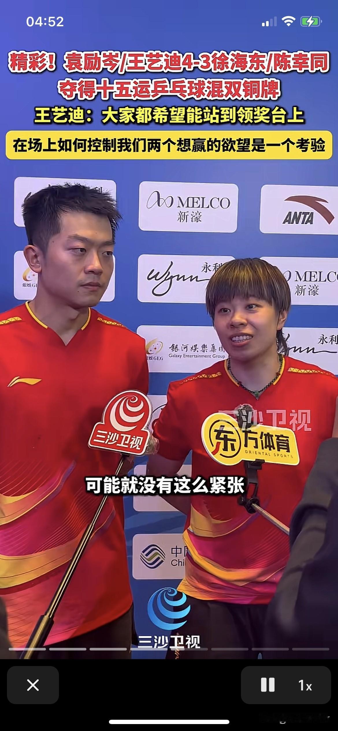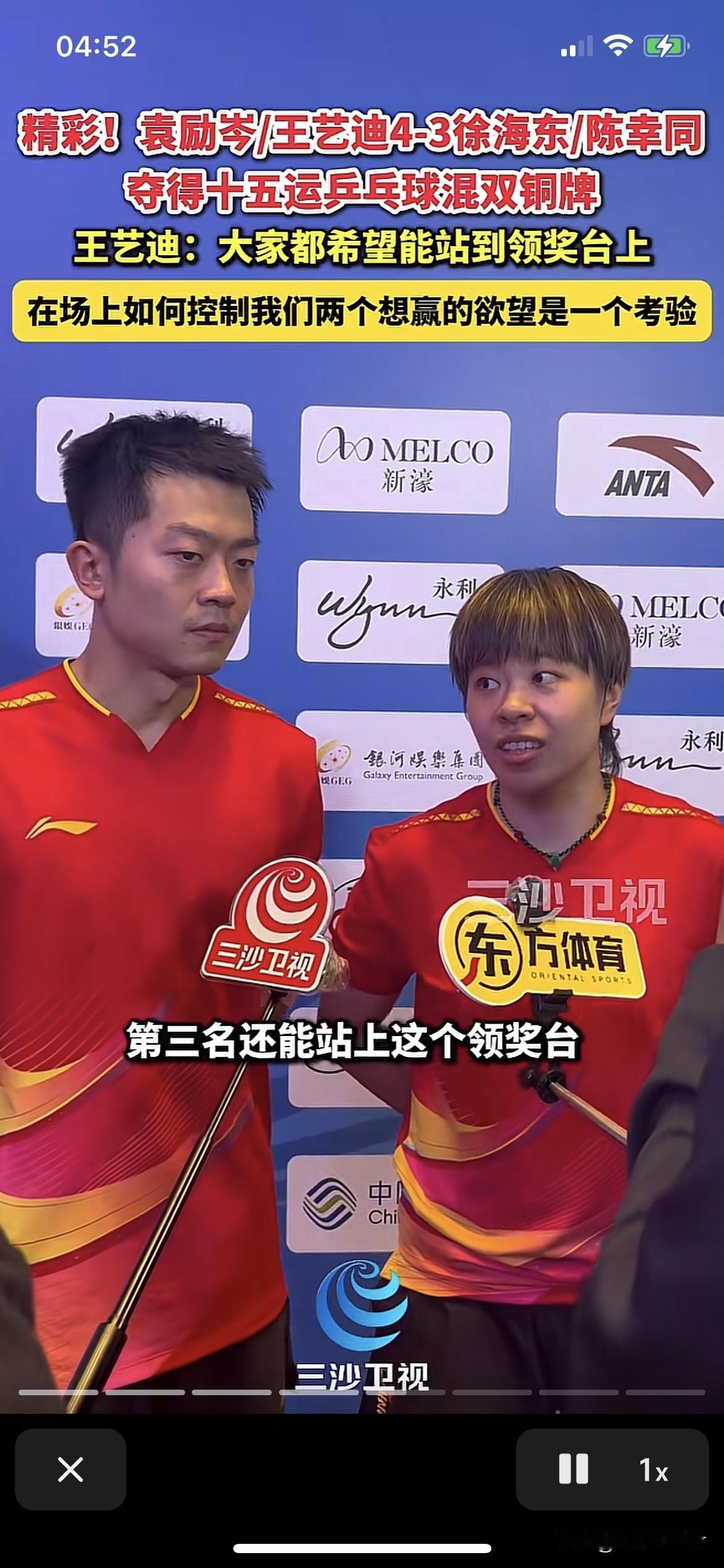 袁励岑王艺迪4:3战胜徐海东陈幸同获得混双铜牌 大迪赛后采访说:怎么能在场上控制住我们想赢的欲望,对于我们两个是一个考验。 一直都是实在真实的大迪,大迪有时候急躁,大迪自己控制住了。大迪经受住考验了[赞] 恭喜王艺迪袁励岑第十五届全国运动会混双铜牌。 大迪蒙彼利埃从头打到尾也没影响全运会拿牌[赞]大迪真棒👍 大迪发言,袁励岑一直在旁边默默的点头。[捂脸][捂脸][捂脸] 小袁这次表现太好了,单双都很好[鼓掌] 大迪我们的牛迪,今天是男双组合,太牛了[赞]