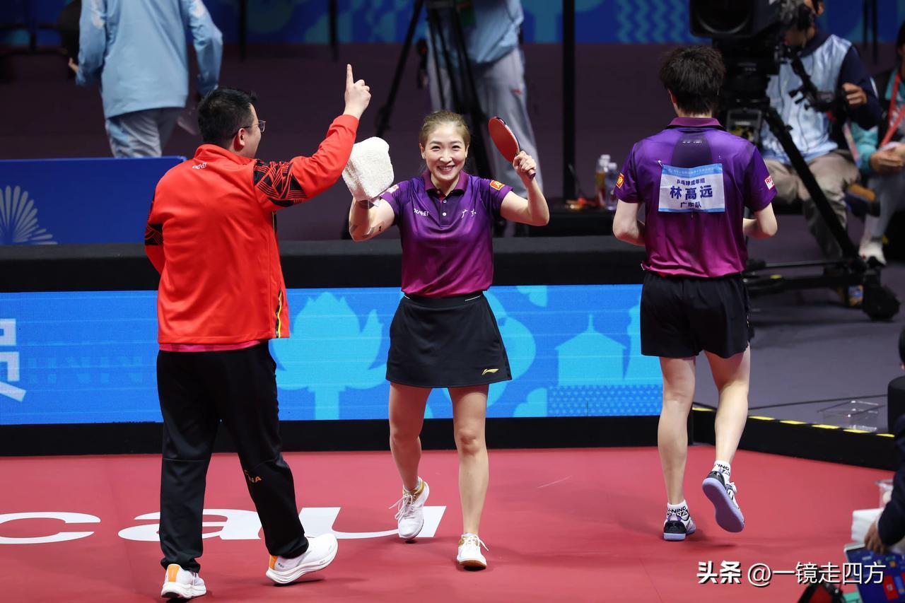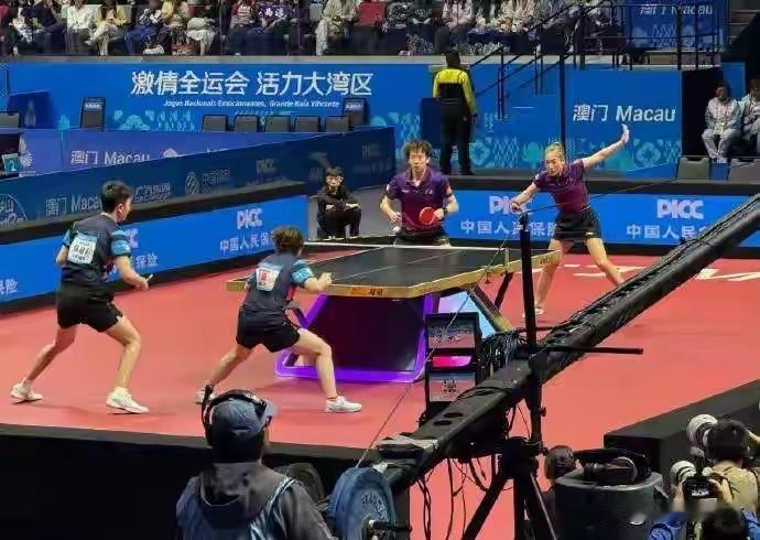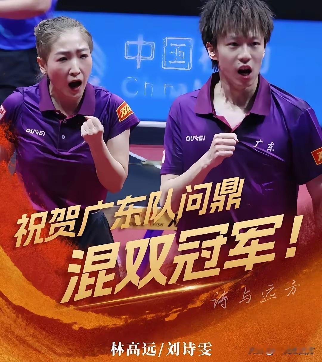 第十五届全运会决出乒乓球项目成年组首个冠军,在混双决赛中,广东队的“诗与远方组合”林高远/刘诗雯在以13-15、8-11先输两局的不利局面下,以11-8、11-8、11-8、12-10连胜四局,以4-2逆转战胜江苏队的年轻组合陈垣宇/蒯曼,夺得冠军,第六次参加全运会的34岁老将刘诗雯继上一届与许昕搭档夺冠后,本届换成与林高远搭档,再次蝉联冠军。季军战是一场辽宁队德比战,最终,袁励岑/王艺迪4-3战胜徐海东/陈幸同,夺得铜牌。