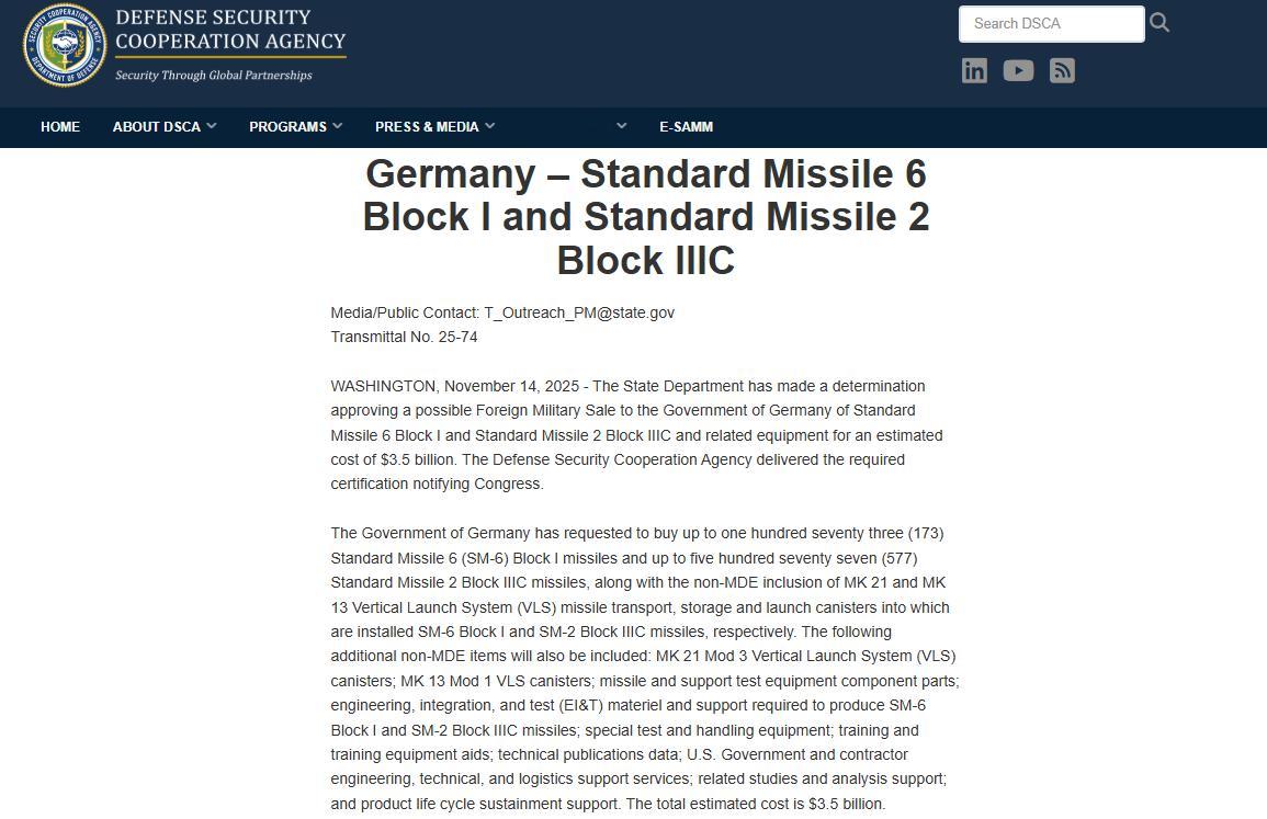 美帝国务院批准了对德国的最多173枚SM-6 block I、577枚SM-2 block IIIC及相关配套的FMS,价值35亿刀