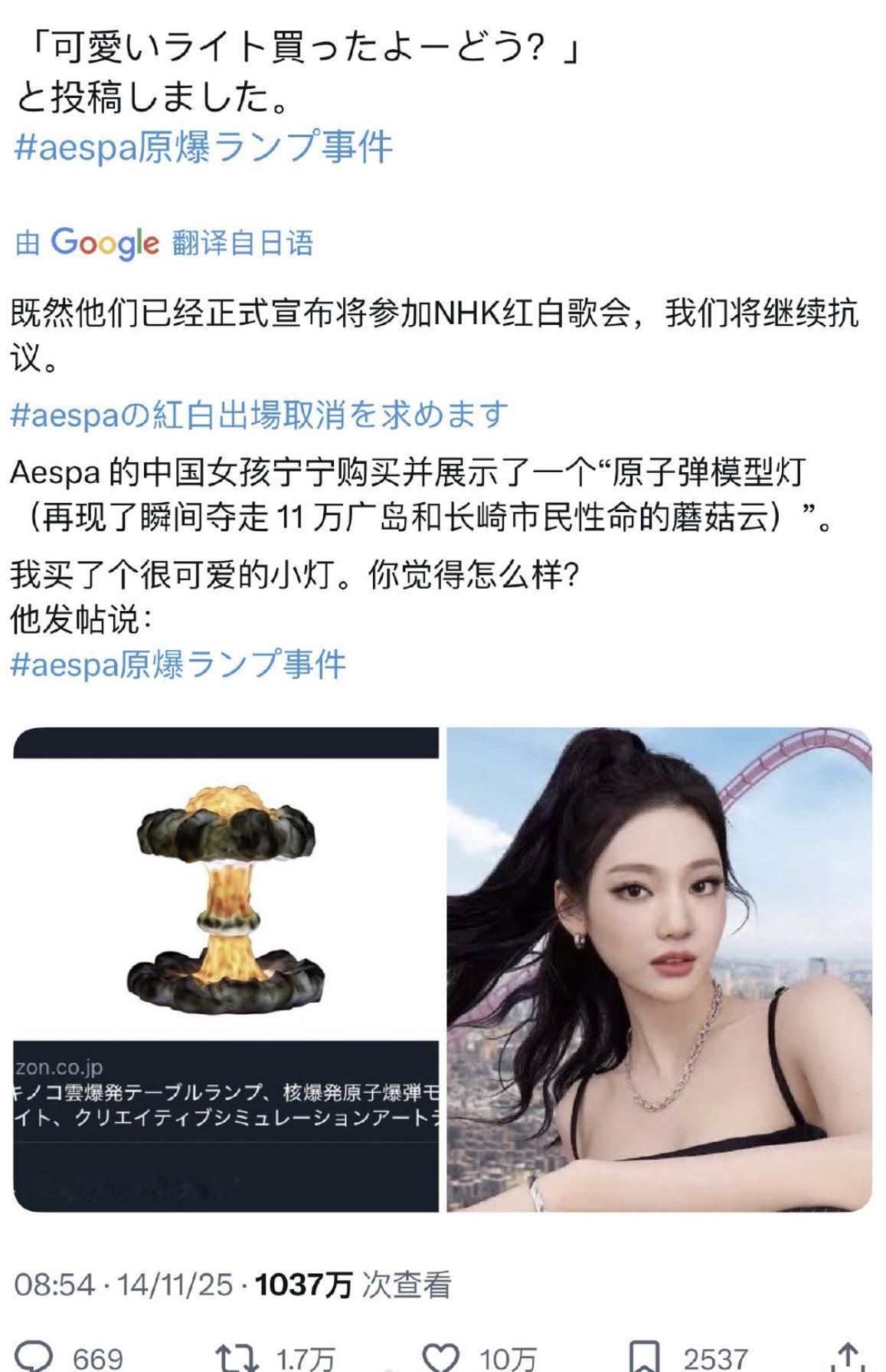 韩国女子组合中的中国女孩宁艺卓因在网上购买了一个自己喜欢的名字叫“广岛之恋”的蘑菇灯,并分享到社交媒体上留言“我买了个很可爱的小灯,你觉得怎么样?” 而遭到日本网民发文抗议抵制她来日本电视台参加NHK红白歌会,因为日本网民觉得这是一个“原子弹模型灯”,严重伤害日本广岛和长崎市民的感情。 支持中国人宁艺卓购买自己喜欢的蘑菇灯并发文分享的自由。 日本人要是不满,应该去找美国人讨要说法,毕竟当年是美国向日本的广岛和长崎投的两颗蘑菇云。
