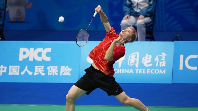 新华社照片,深圳(广东),2025年11月14日11月14日,江苏队选手石宇奇在男单比赛中回球。他对阵浙江队选手孙超。当日,在深圳举行的第十五届全国运动会羽毛球男子团体决赛中,江苏队对阵浙江队。新华社记者陈思汗摄