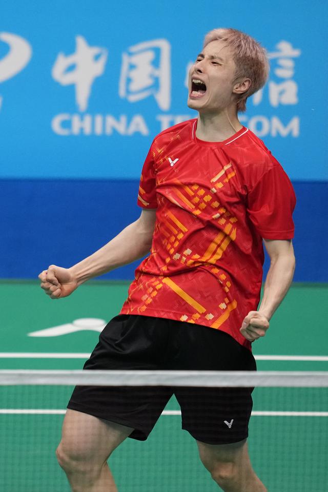 新华社照片,深圳(广东),2025年11月14日11月14日,江苏队选手石宇奇在男单比赛获胜后庆祝。他2比1战胜浙江队选手孙超。当日,在深圳举行的第十五届全国运动会羽毛球男子团体决赛中,江苏队对阵浙江队。新华社记者陈思汗摄