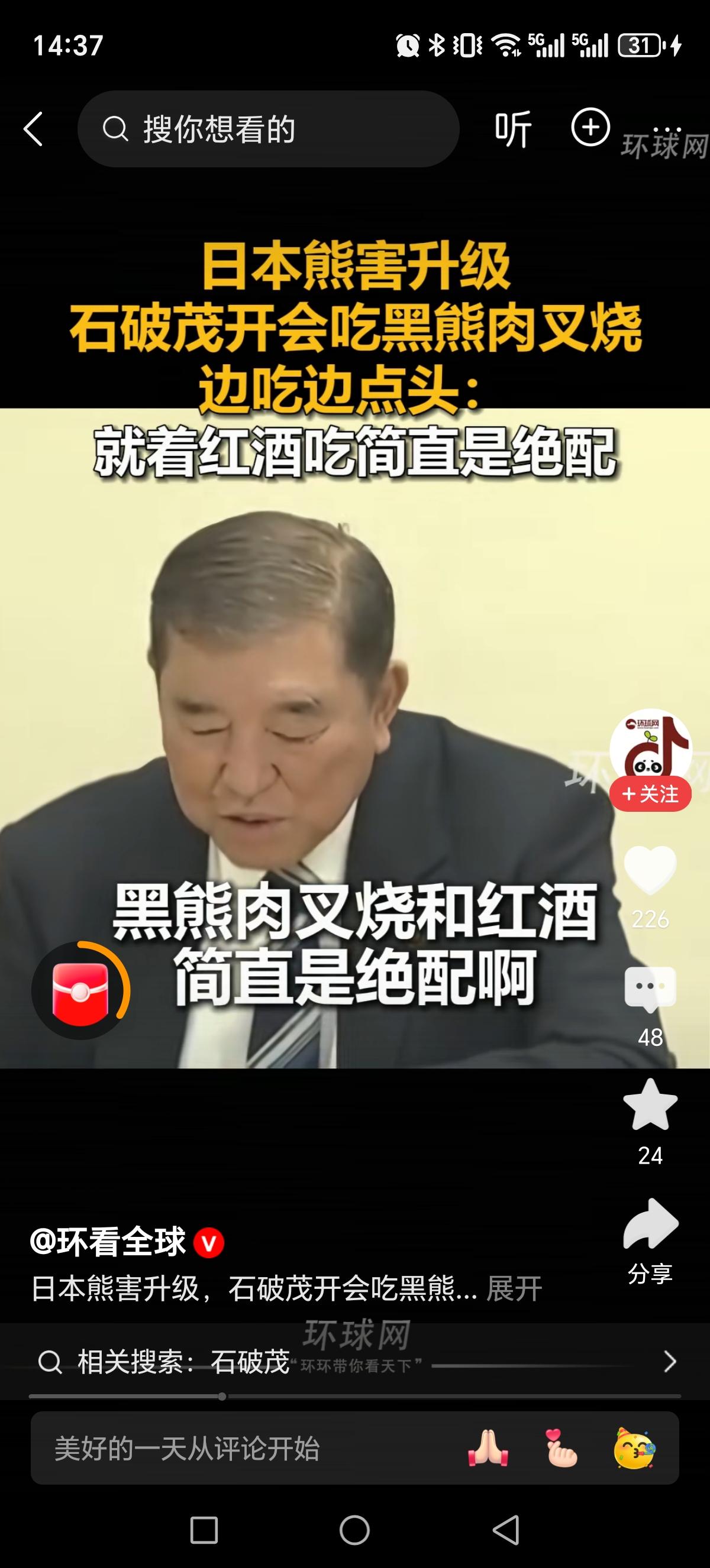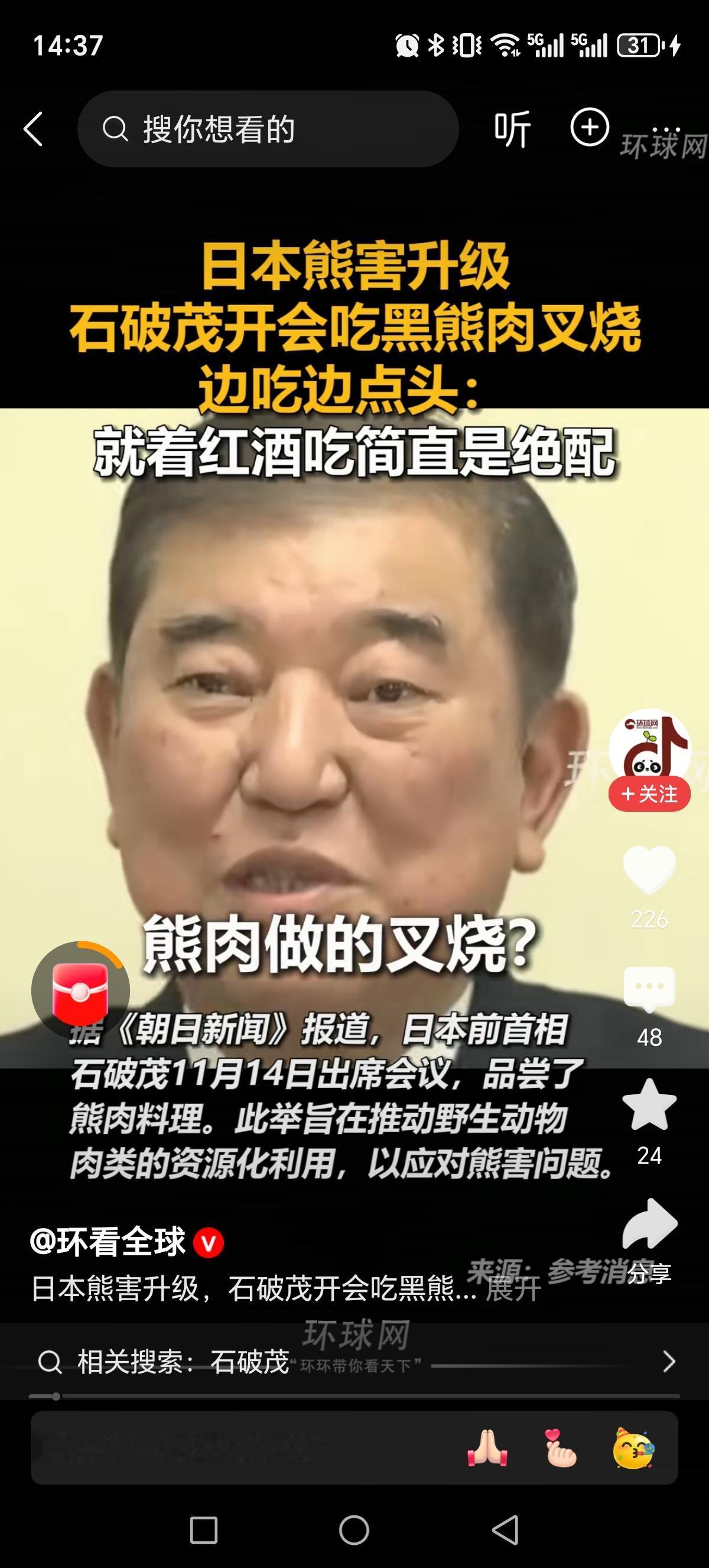 日本前首相这波操作也太离谱了!熊害泛滥不想着从根源解决,居然带头吃黑熊肉叉烧还喊着配红酒绝配? 日本各地熊害都闹到致13人死亡,警方都放宽枪支规定允许射杀熊了,石破茂却在会议上高调试吃黑熊叉烧。美其名曰“推动野生动物肉类资源化”,可一边说要恢复山林让熊回归栖息地,一边用吃来“解决问题”,这逻辑实在让人看不懂。 本质上,熊害的核心是生态失衡、栖息地被破坏,靠“吃”根本治不了本,更像一场博眼球的作秀。野生动物保护和灾害治理,从来不是靠猎奇吃法就能搞定的。 你觉得这种“以吃代治”的方式能真正解决熊害吗?还是只是另一种形式的炒作?