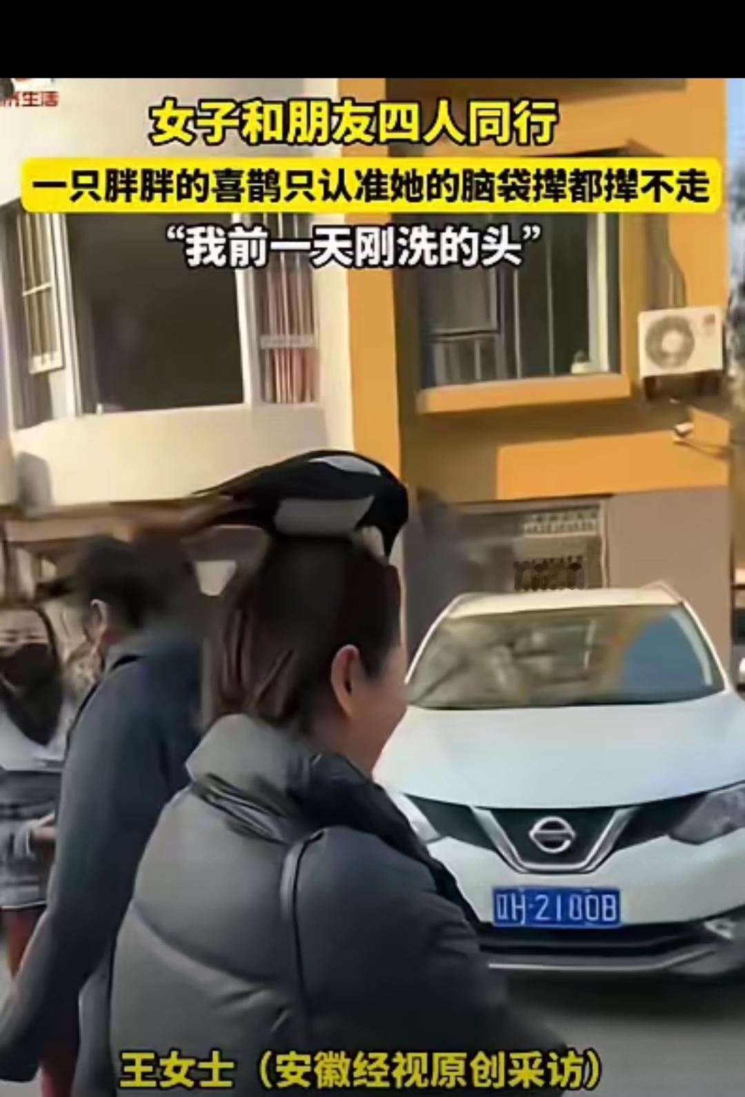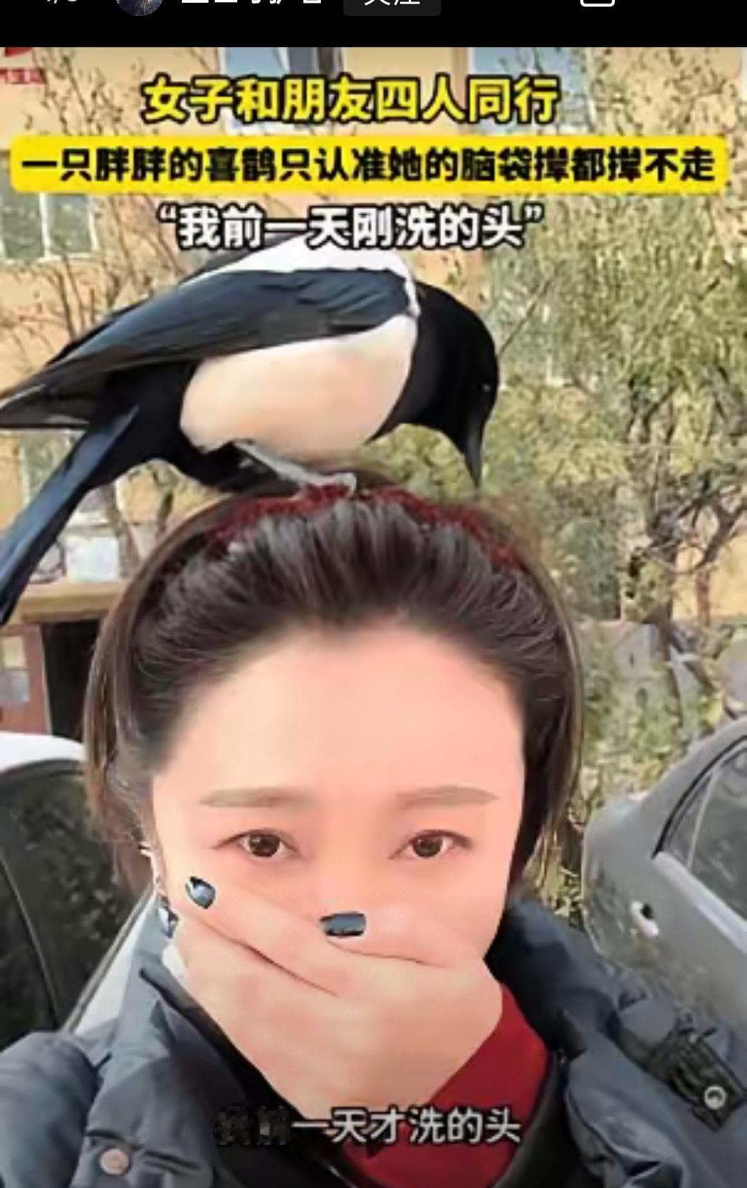 辽宁营口这只喜鹊也太会“贴贴”了!摸了下后背就赖上女子头顶,撵三次都执着飞回,这
