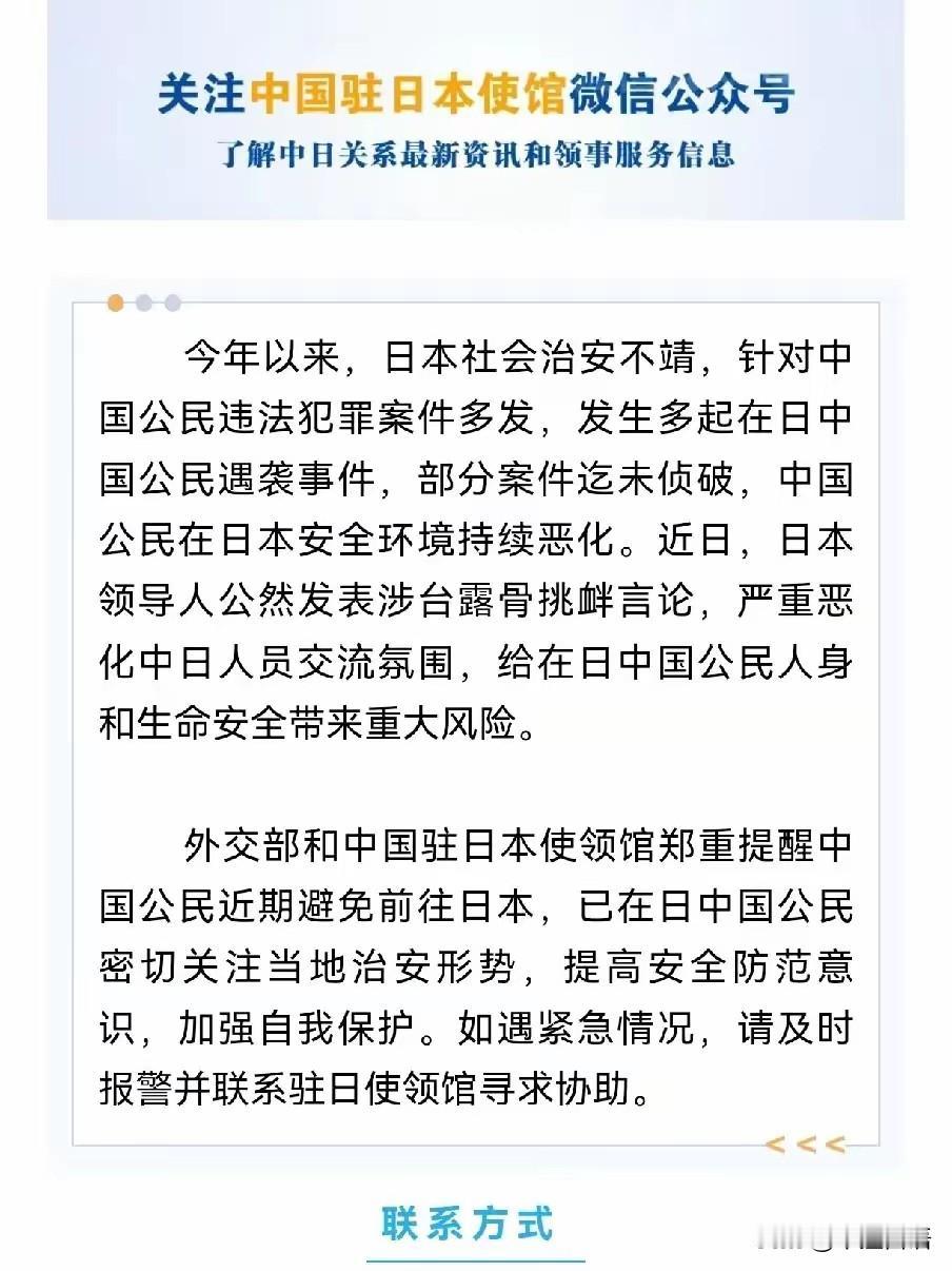 这次我们是真的生气了,外交部都发文提醒在日的中国公民注意自身安全。 以我十年来对外交部的研究这个提醒再升级就是撤侨了。 另外外交部奉示召见日本驻华大使,我们的驻日大使又奉示去日本外务省要求高市撤回言论。 日本那边高市拒绝撤回,反而支持荷兰安世,外交部给的回应是,高市越过红线了。 我们的海军已经在鹿儿岛附近自由航行了。现在就看谁先缓和了,如果高市梗着脖子,是没办法缓和局势的。 不要小看这次事件,这应该是改革开放之后最大的事,最终应该是综合对决。外交、经济、政治、军事都会轮番搞它。 我们这些年太拿不定主意了。拿台湾开刀实在不合适,毕竟还有中国人;菲律宾又太弱小,还得考虑一堆东盟以及各种小国的看法。 日本好啊!国仇家恨犹未雪。