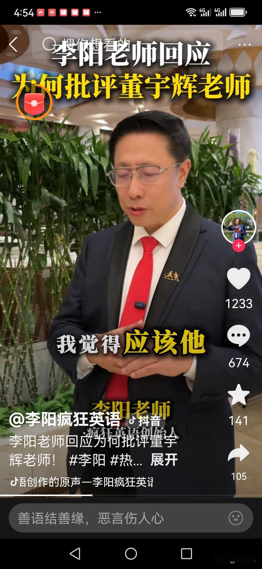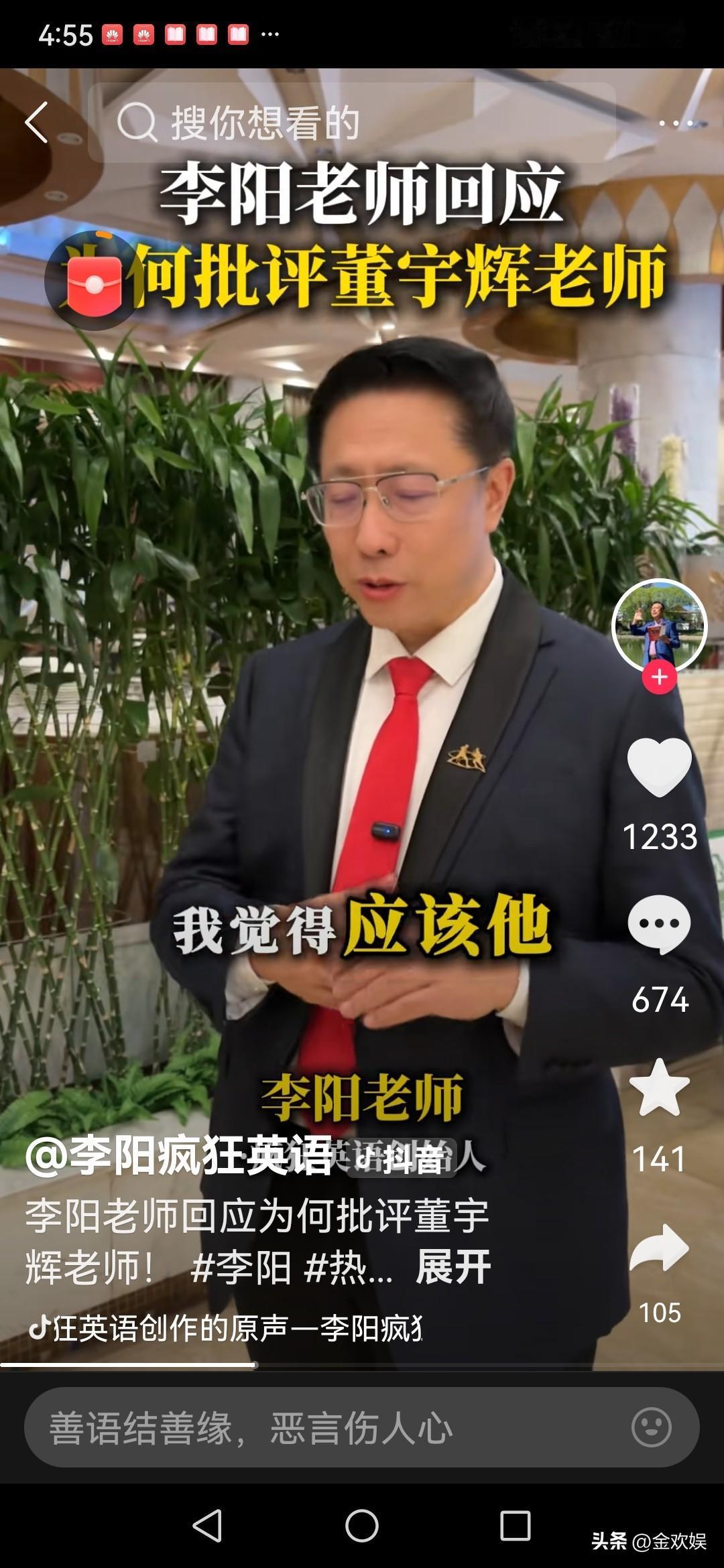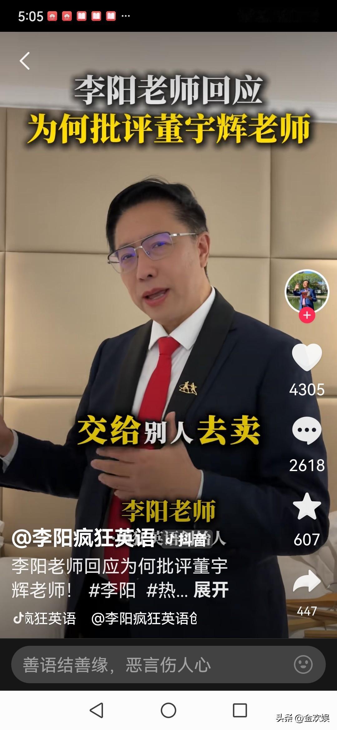 11月15日,李阳发视频回应为何批评董宇辉,他说:“很多朋友告诉我,我批评董宇辉