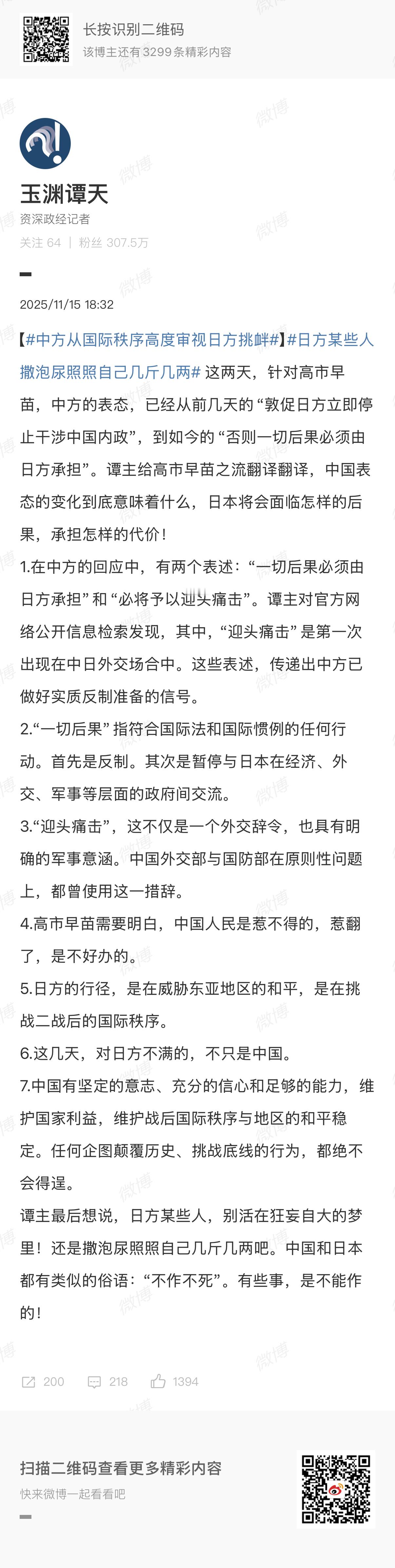 🔻谭天说:日方某些人撒泡尿照照自己几斤几两。