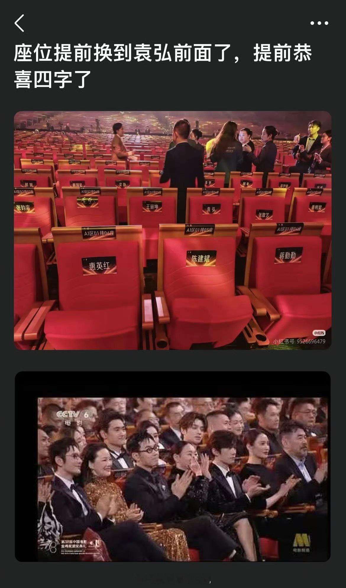 今晚袁弘坐在易烊千玺后面,易烊千玺拿到了金鸡奖影帝,之前的四个金鸡奖影帝,梁朝伟、张译、朱一龙、黄小明,身后都坐着袁弘,袁弘是帝后吧,每次都坐在影帝身后,明年袁弘前面的座位要收费了