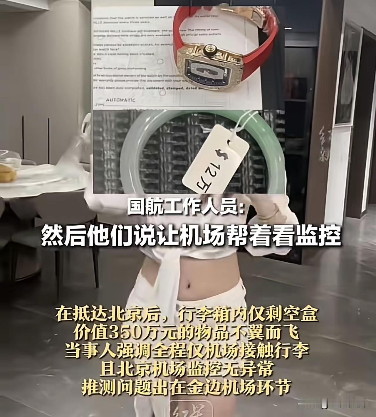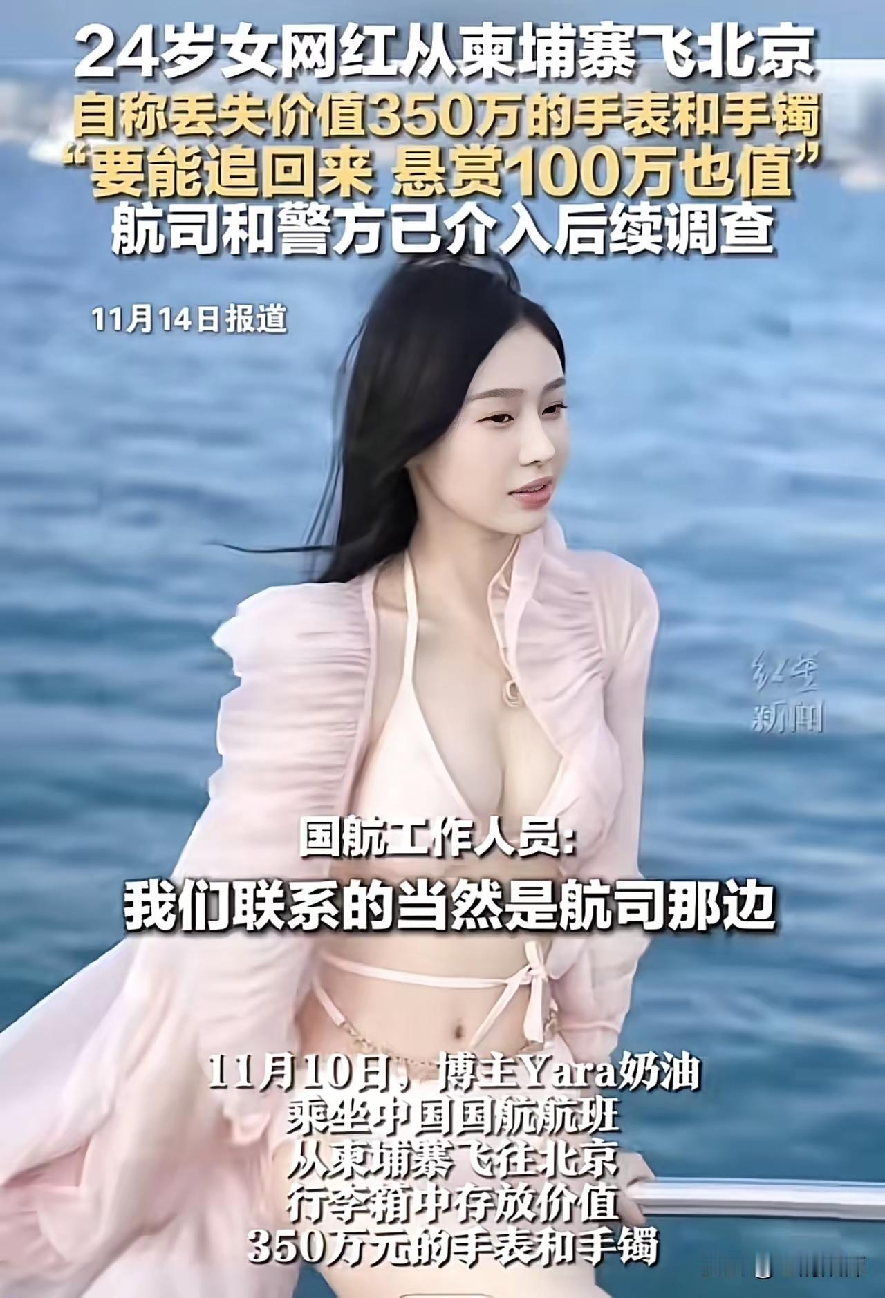 24岁女网红从柬埔寨飞北京,丢失价值350万的手表和手镯,目前悬赏100万找回来,我质疑这个新闻,明明可以随身带的东西,偏偏要托运?手表手镯都可以带在手上,所以这个事有点反常。