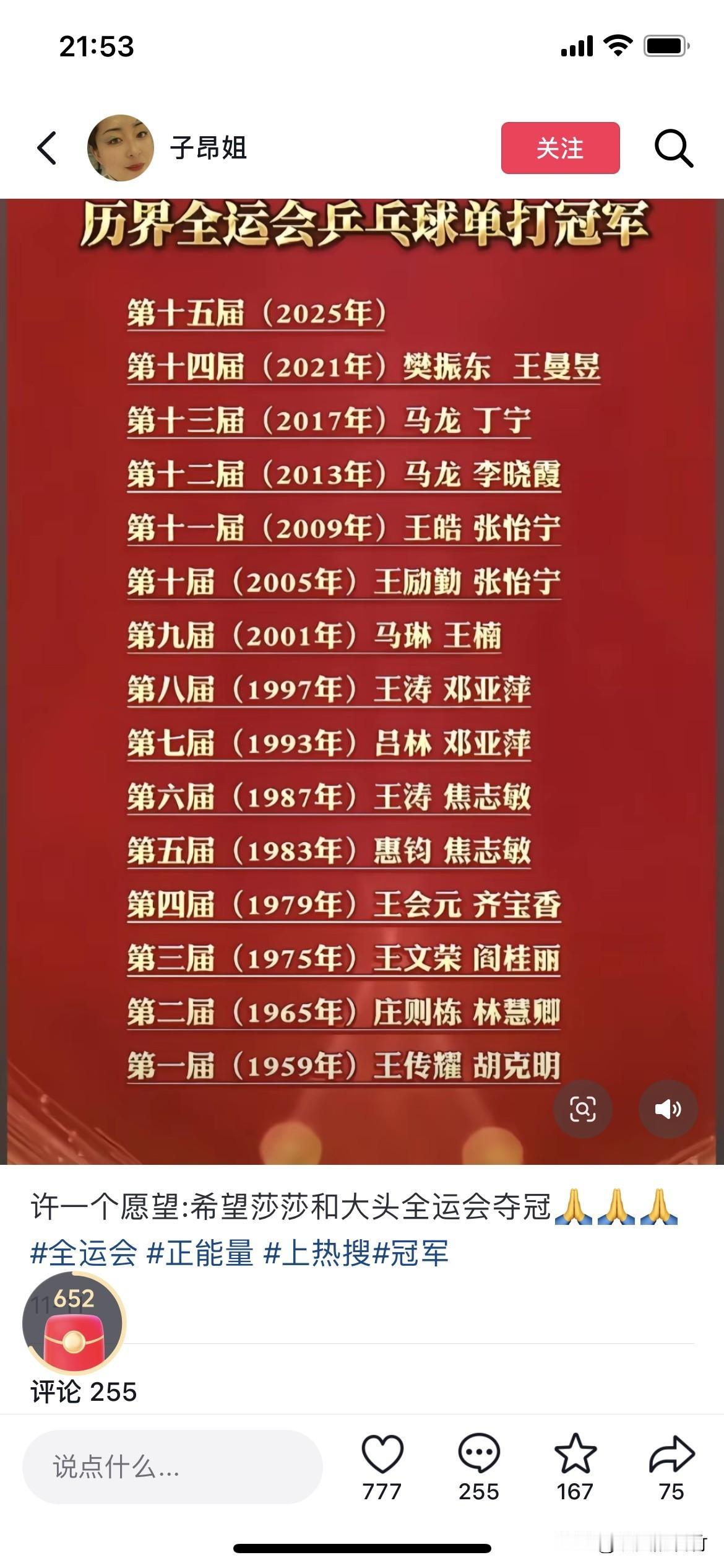 希望王曼昱能够卫冕冠军! 黑龙江王曼昱4:0陈梦晋级决赛 全运会女单半决赛 黑龙江王曼昱4:0山东陈梦 第一局王曼昱11:4战胜陈梦 第二局双方打到10:10,王曼昱得分11:10,王曼昱局点,王曼昱得分12:10。 第三局王曼昱11:3战胜陈梦 第四局王曼昱11:9战胜陈梦 王曼昱4:0陈梦晋级决赛 给我们黑龙江姑娘王曼昱点赞👍 曼昱太棒了!零封陈梦!晋级决赛! 居然零封了巴黎奥运会女单冠军陈梦。真没想到。 上一届全运会,半决赛王曼昱也是4:0陈梦[赞][赞][赞]决赛王曼昱获得冠军🏆 希望王曼昱卫冕冠军!