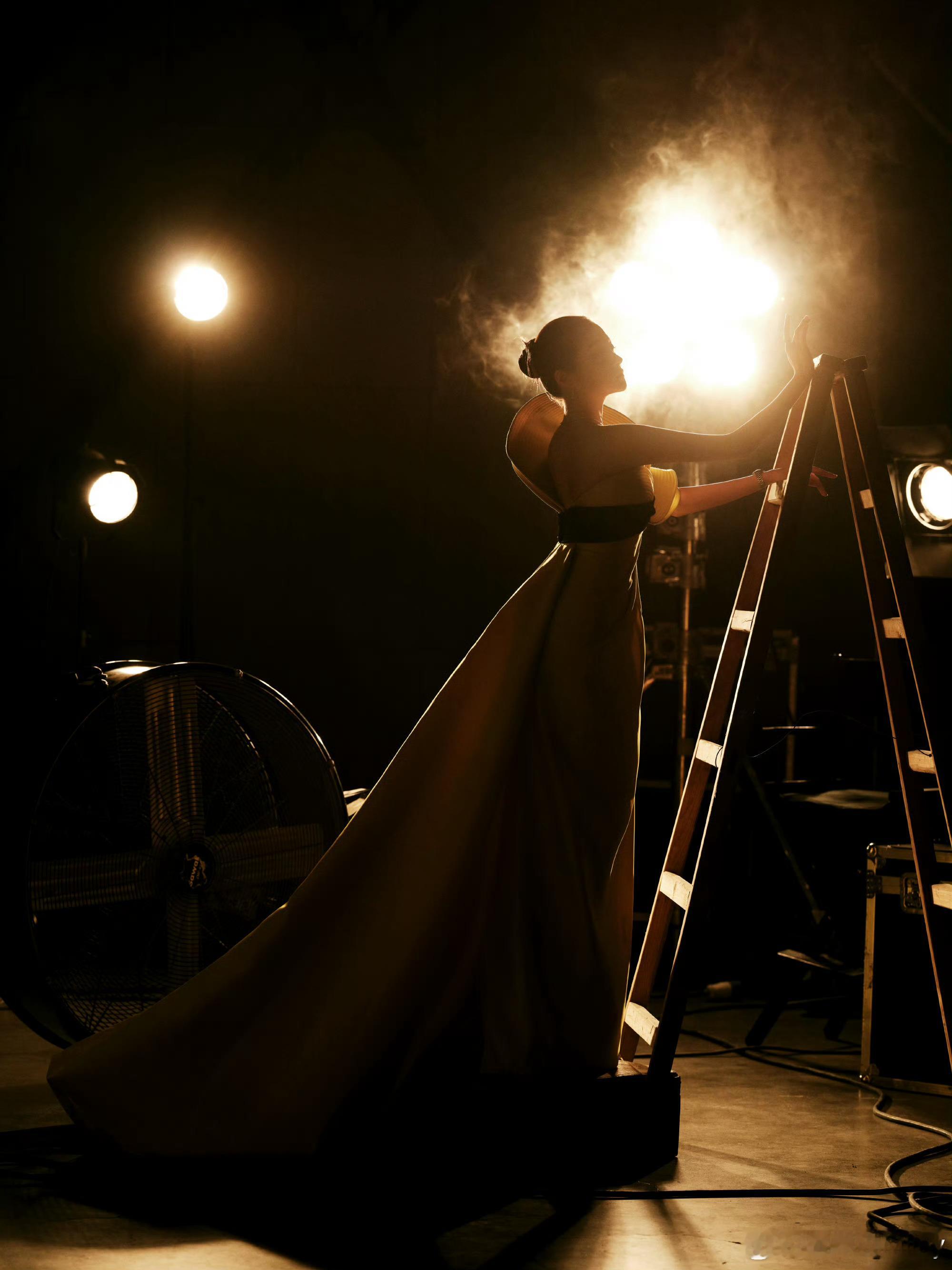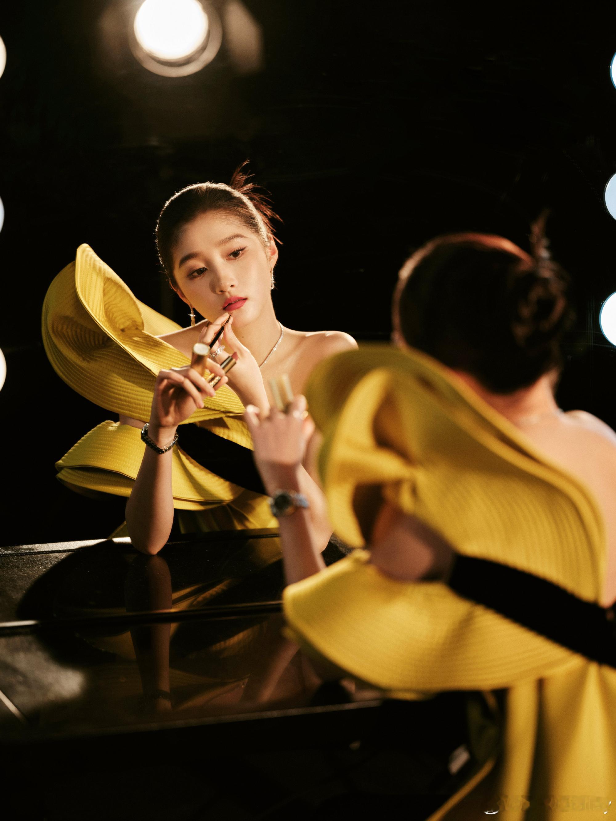 身穿 Georges Chakra 2025秋冬定制系列 明黄色缎面长裙,单肩不对称剪裁,裙身铺满立体蕾丝花瓣,拖尾设计如盛开花束。复古贴头皮高盘发髻,突出饱满头骨与天鹅颈线条,冷白皮与亮黄色形成鲜明对比。佩戴Fred珠宝及Omega腕表,简约珠宝强化高级感。