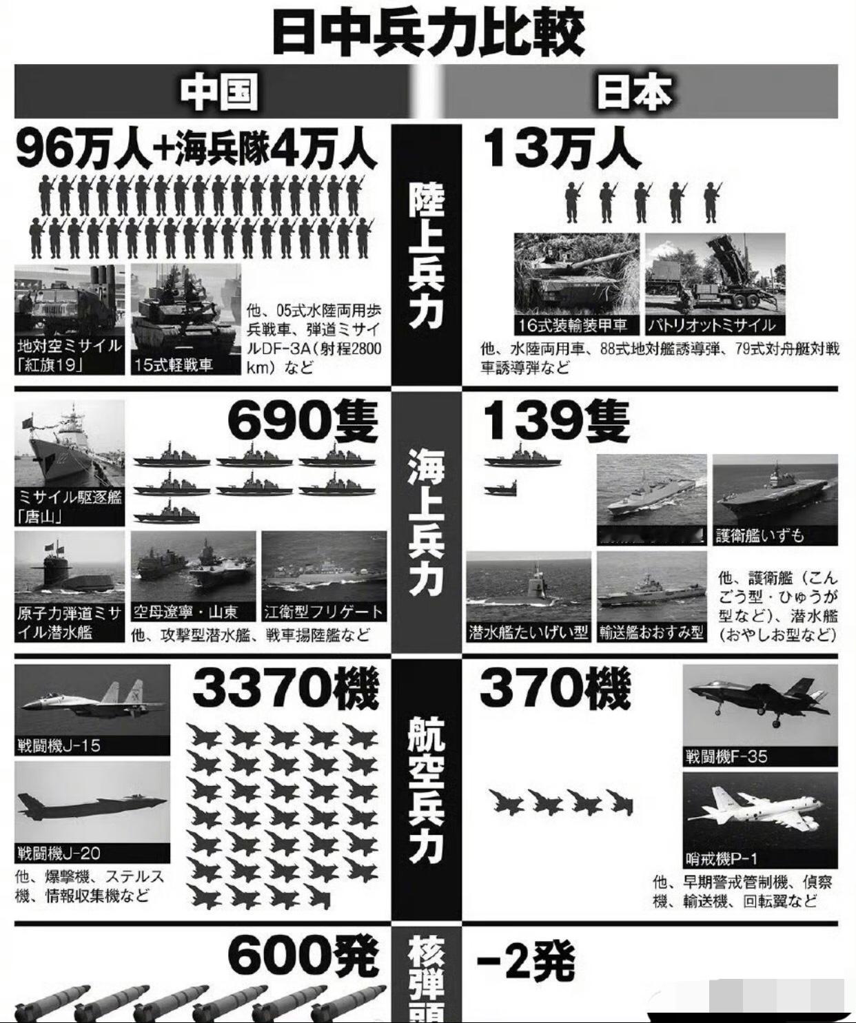 中日武器装备对比,日本核弹头有-2发,这在世界上是独一份的,是美国“送”给日本的,要不然日本也没有。