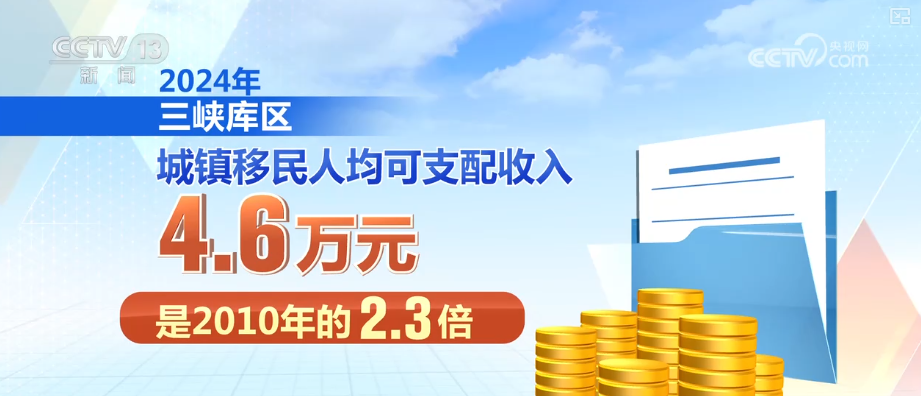 “十四五”期间,三峡库区移民安稳致富实现了阶段性目标。通过扶持优势特色产业等综合措施,累计新增就业岗位44万个。2024年,三峡库区农村移民人均可支配收入2.2万元,是2010年的4.19倍,年均增长率10.5%;城镇移民人均可支配收入4.6万元,是2010年的2.3倍。人居环境持续改善,库区基础设施和公共服务设施不断完善。