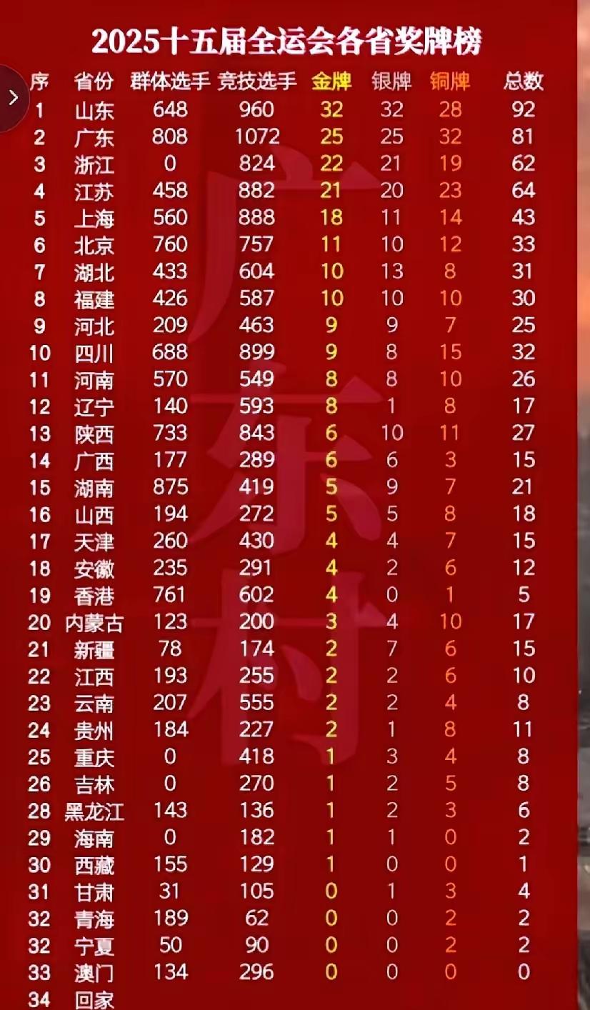 谁英雄谁好汉,竞技场上看 友谊第一,比赛第二 十五届全运会最新金牌榜 (数据截止2025.11.15.19:30)