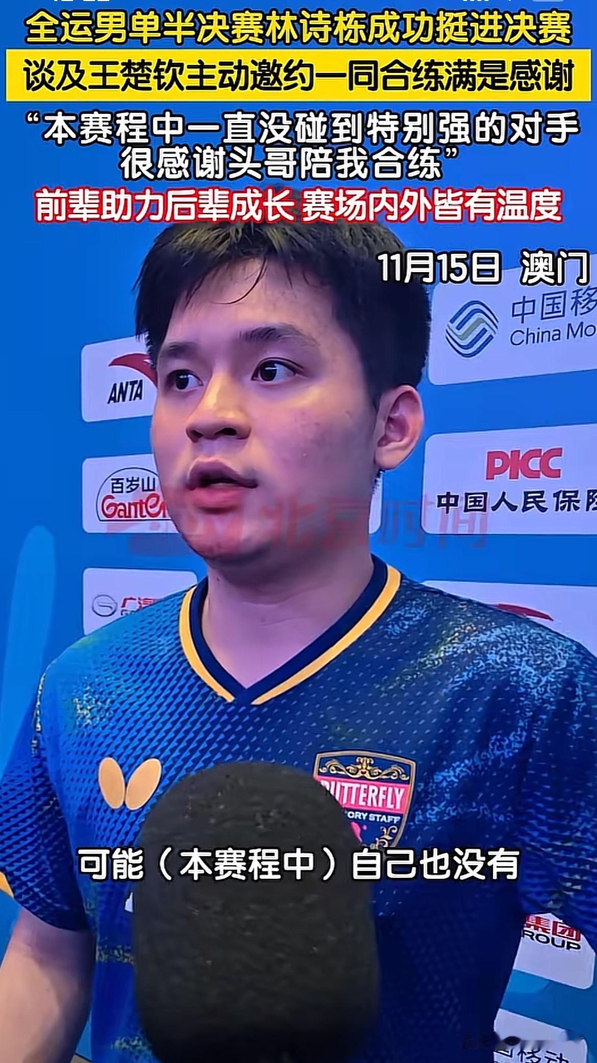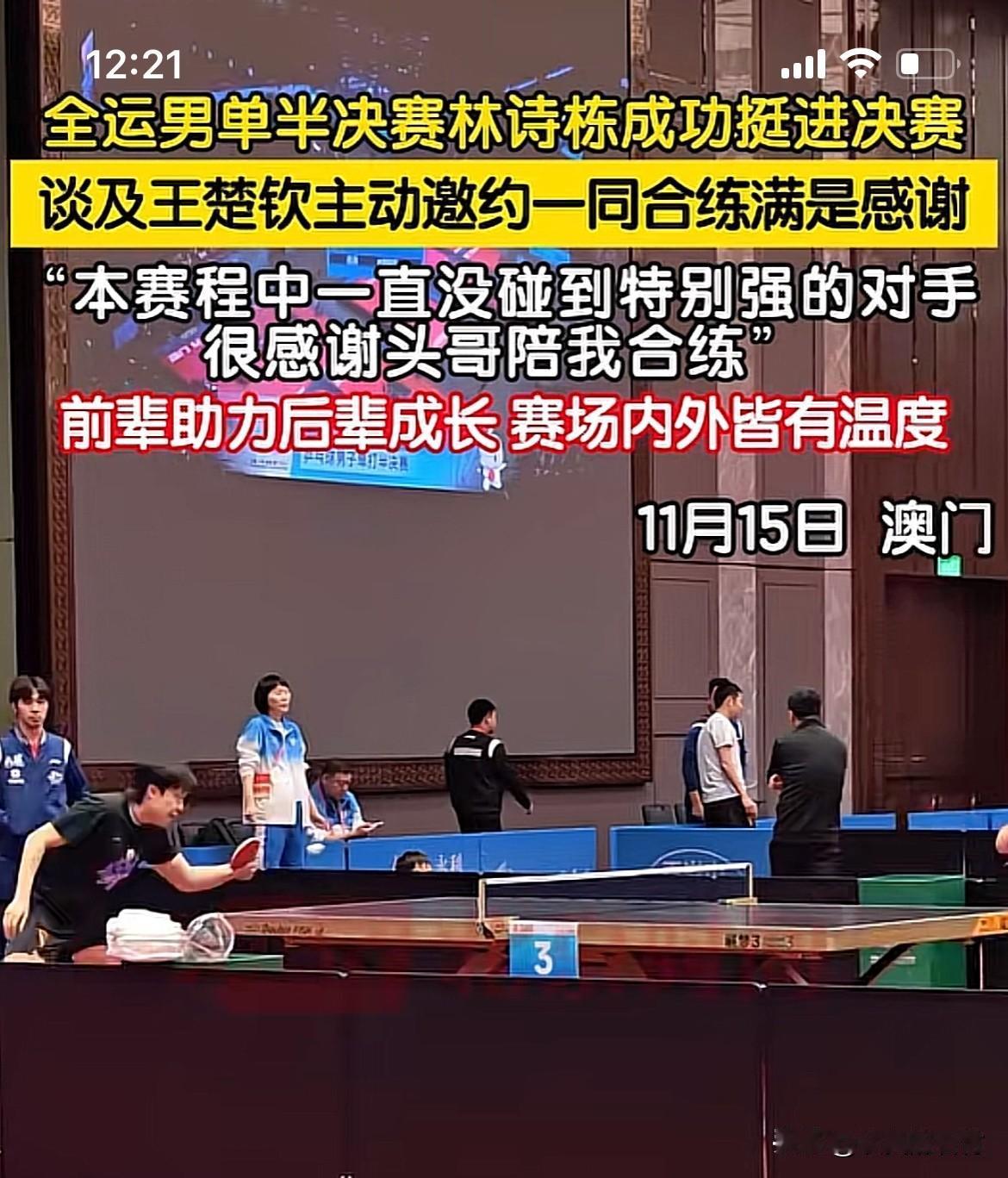 15日决赛前王楚钦陪林诗栋对练。 小石头说决赛前也没有遇到特别强的对手。非常感谢头哥和我一起训练。 之前樊振东也陪林诗栋训练。 小石头没有陪练。他的头哥、东哥都陪他一起训练。 陪练很重要,越是高手陪练进步才会越快。 虽然说训练是相互的,但是王楚钦林诗栋对练对林诗栋帮助大。 16号 王楚钦对阵袁励岑是稳赢的 林诗栋对阵樊振东基本是输。 感谢王楚钦帮助林诗栋。林诗栋加油。多赢下几局。