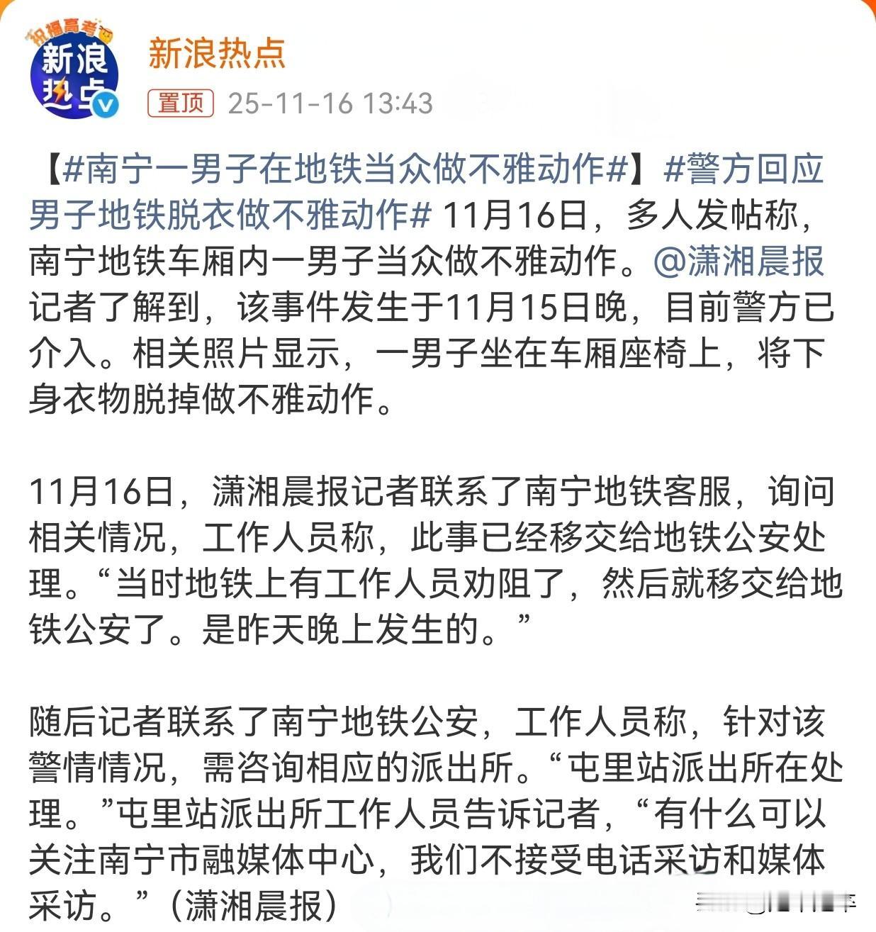 南宁地铁这是怎么了?!“大便哥”才完事,又来了一个“✈哥”[what] 11月15日晚,南宁地铁车厢内一男子当众脱掉下身衣物做出不雅动作,被乘客拍摄照片并举报,现场工作人员发现后立即劝阻,并将涉事男子移交地铁公安处理。警方介入调查,案件由屯里站派出所承办。目前还未有任何结果。 在11月11日一男子在南宁地铁3号线总部基地站台柱子旁当众大便之后,事发地竟成网红打卡点,多人模仿摆拍嬉笑。这次事件或许也是模仿蹭流量的。 这次这位男子的行为已涉嫌违反《治安管理处罚法》。这样的行为已超出一般不文明范畴,涉嫌构成寻衅滋事。即便未直接攻击他人,但其行为严重破坏公共场所秩序,导致乘客生理不适、心理反感。根据《治安管理处罚法》第二十六条,结合其行为的恶劣程度,可能处五日以上十日以下拘留,并处五百元以下罚款。如果警方认定“情节较重”,如引发公共秩序混乱、造成较大社会影响,可能延长至十日以上拘留。 我很不理解,“当众大便”事中有哪里值得模仿呢?这个人由是什么心态呢?人都有好奇、围观的心理,但这种将不雅行为娱乐化、戏谑化的跟风,显然已经超越了一场无伤大雅的玩笑,本质上是对公共秩序的二次破坏,不仅无助于公共文明的提升,反而助长了失范行为甚至违法行为的传播。南宁地铁频发类似事件,公安部门必须要重拳出击,让网络跟风审丑、破坏公序良俗行为终止在萌芽里。地铁上奇葩行为