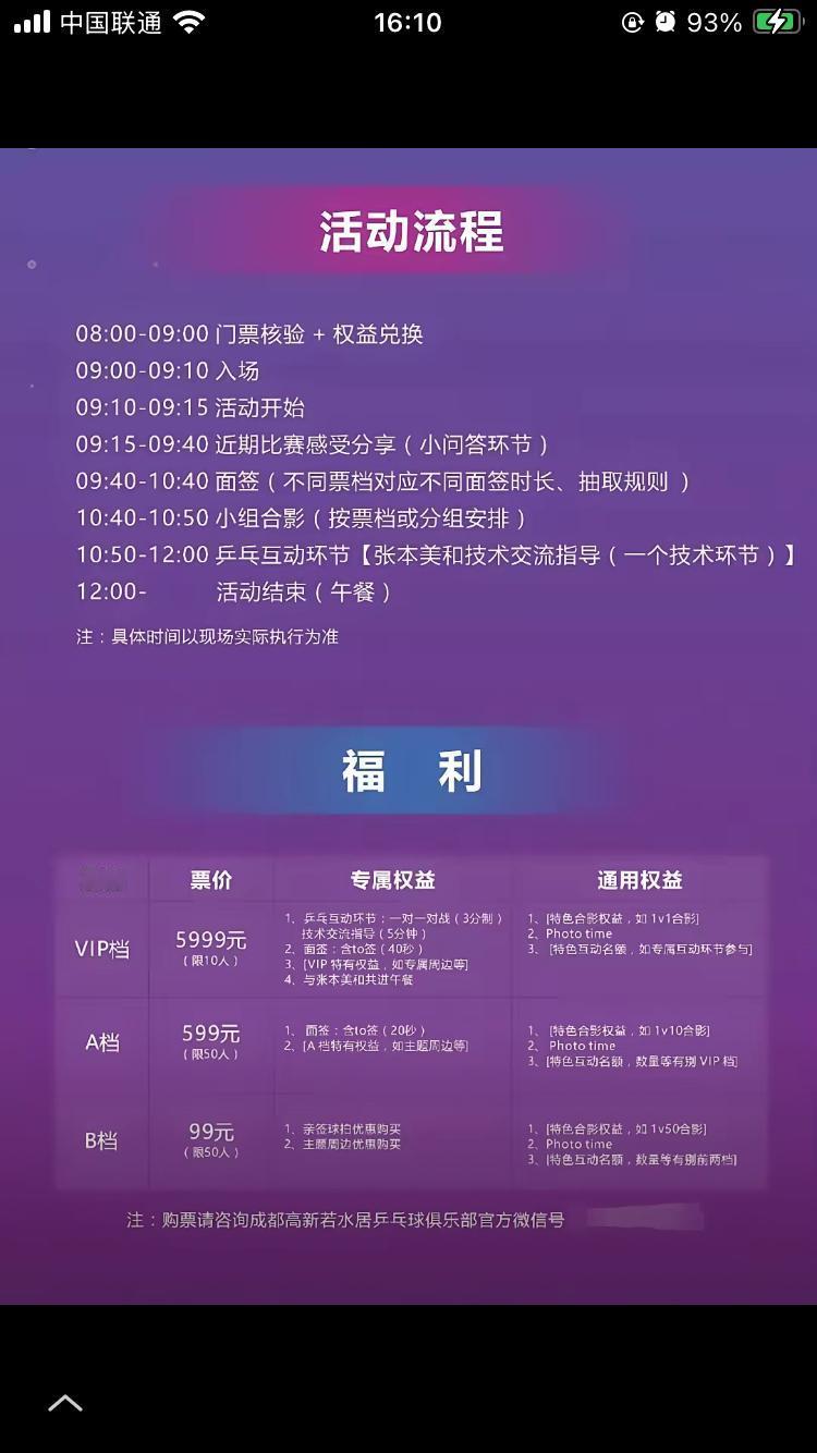张本美和四川人的骄傲,成都人的骄傲,通过自己刻苦训练,努力拼搏,终于成为了日本人。 乒乓球的排名高居世界第六,为了回馈四川人和成都人的厚爱,在成都举行球迷见面活动。 5999 VIP可以和张本美和一对一见面指导5分钟乒乓球经验,还可以共进晚餐。 599元可以当面和张本美和签名见面20秒,还可以大合影。 99元可以购买张本美和的相关产品,还可以来一个超大合照。 机会相当难得,与这位变成日本人的四川人合影,这是一个千载难逢的机会。