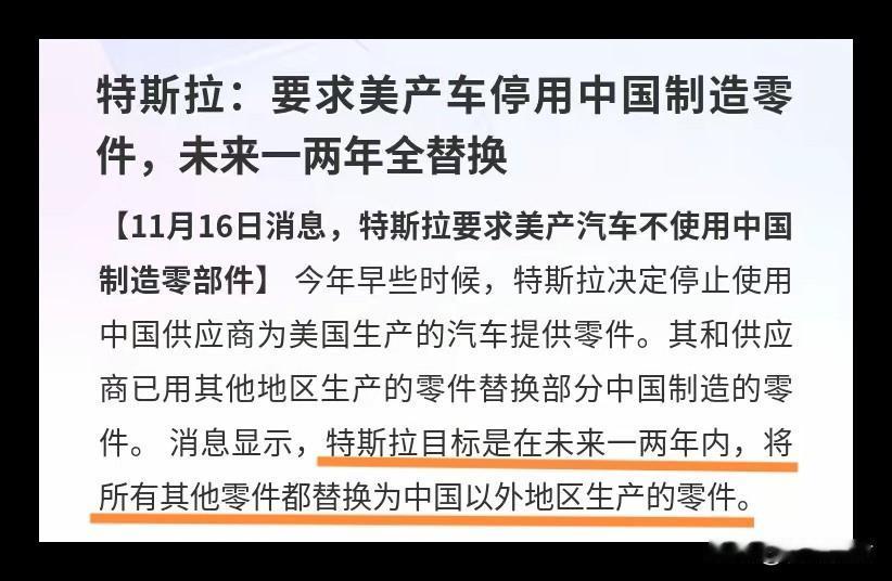 特斯拉要求美产汽车停用中国货制造零部件! 特斯拉这又是搞什么,竟然要停用中国制造的汽车零部件给美国生产的汽车用,并且要在未来一两年内完成这一目标,不知道这是漂亮国政府的意思还是特斯拉公司的行为呢? 按道理来说公司不至于这样吧,毕竟对于公司来说,利益至上,物美价廉的零部件肯定是目标! 你如何看待这件事?