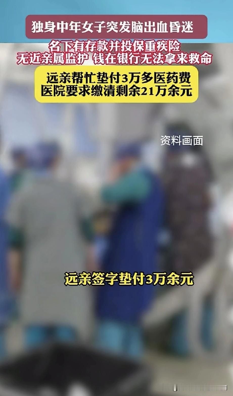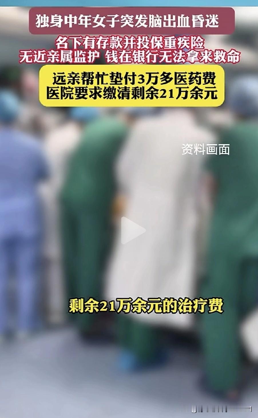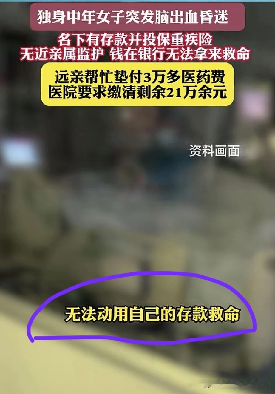 独身中年妇女突发脑出血昏迷,名下虽有存款且投保重疾险,却无法用于自救。 上海有位中年妇女,突发脑出血昏迷,送医后需紧急手术。因无直系亲属担任监护人,找来远亲签字帮忙垫付了3万元医疗费。该女子名下有存款,也投保了重疾险,一直在重症监护室抢救。然而,女子父母双亡、未婚未育,没有近亲属监护,昏迷的她无法动用自己的存款,银行拒绝支付医疗费,保险公司也拒赔。医院要求缴清医疗费,剩余21万治疗费远亲无力承担,只能向属地居委会求助。居委会找到银行,银行要求其出具女子无亲属证明,而派出所只能提供未查到亲属记录的说明,流程陷入僵局。最后只能走法院流程,需先宣告女子为无民事行为或限制民事行为能力人,再指定其监护人。 医院无法直接从她账户里拿钱,怕后续说不清,但又没人帮她付钱,就等同于不付钱。 这便是丁克的后果。如今一些年轻人独自生活,若一生没经历过什么苦难,到老时无依无靠、无人相助,最为痛苦。钱并非能解决所有事情。 在此情况下,生病女子的房产、银行存款、保险金该如何处理,怎样才能用于治疗?若因没钱耽误治疗而身亡,责任由谁承担?死者的房产、银行存款、保险金又该怎么办? 对此大家怎么看?