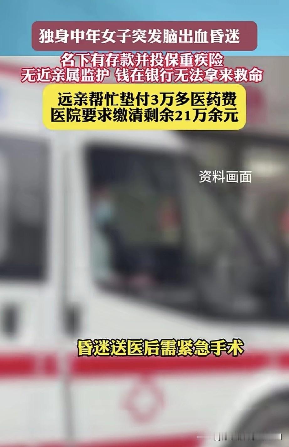 独身中年妇女突发脑出血昏迷,名下虽有存款且投保重疾险,却无法用于自救。 上海有位