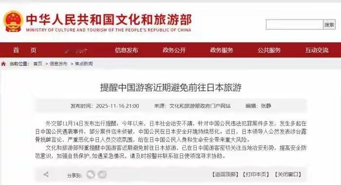 中方实质性反制又来了!继中国外交部提醒后,文旅部再次郑重提醒中国游客近期避免赴日旅游。 16日文旅部在官网发布上述警示,并提示已在日本中国游客关注当地治安形势,提高安全防范意识,加强自我保护。 既然国家多次反复的强调了日本不安全,笔者认为我们老百姓就好好听话,支持国家的行动。旅游嘛,到哪不是玩?在这么个特殊的时期就算了。以前还好,大家相安无事,暂时忘记了以前的历史。现在出了这么个日本首相,拉起了日本国内的“反华”情绪。既不安全又不安全还是不安全。咱就不要冒这个险了,也别给国家添乱。 说实话,真想去,也可能不用等太久。高市来这么一出,也许她可能支撑不到日本最近三十年来平均任期“1.3年”的时间。还有就是某种不可抗力的原因,对其执行旧敌国条款,重新执行《波茨坦公告》。到时带着胜利的雄风领略富士山的樱花如何?