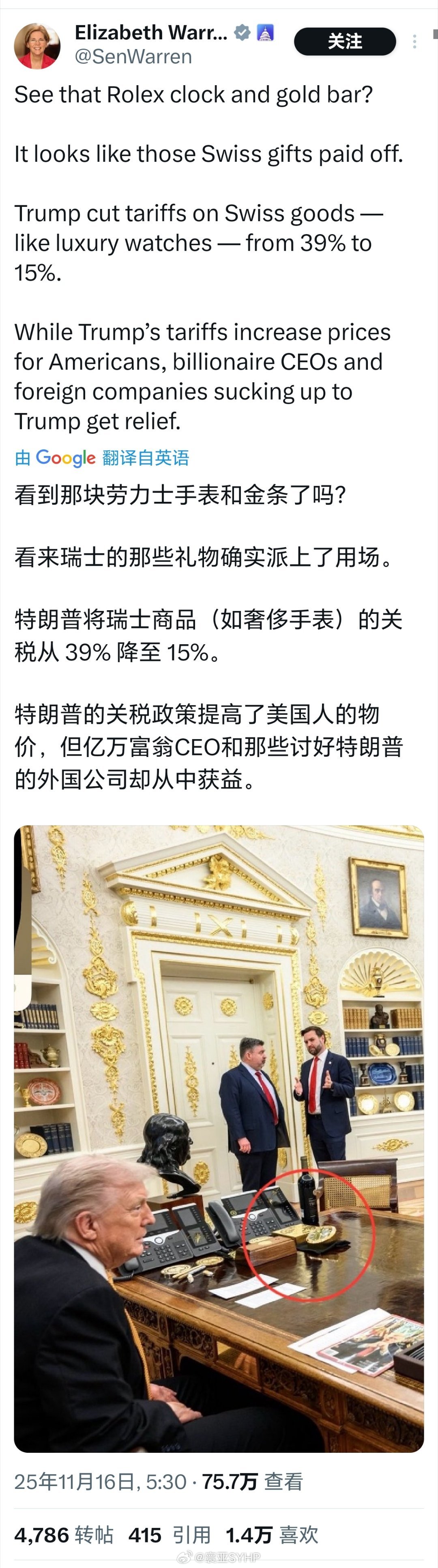 美国民主党参议员伊丽莎白·沃伦评论特朗普给瑞士降低关税