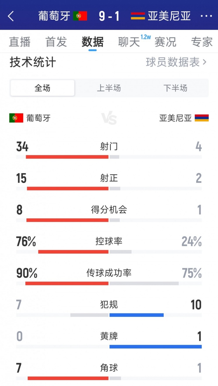 直播吧11月16日讯在本轮世预赛,葡萄牙9-1击败亚美尼亚,以下为双方全场数据对比: