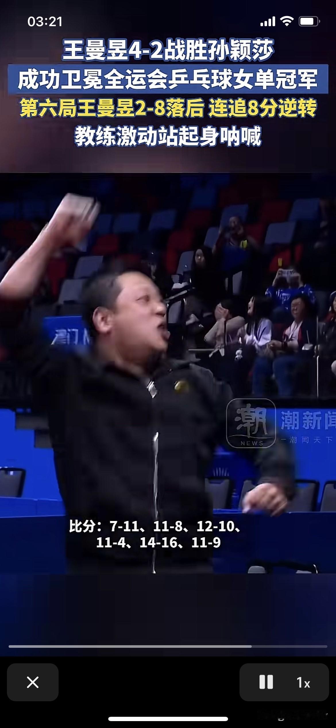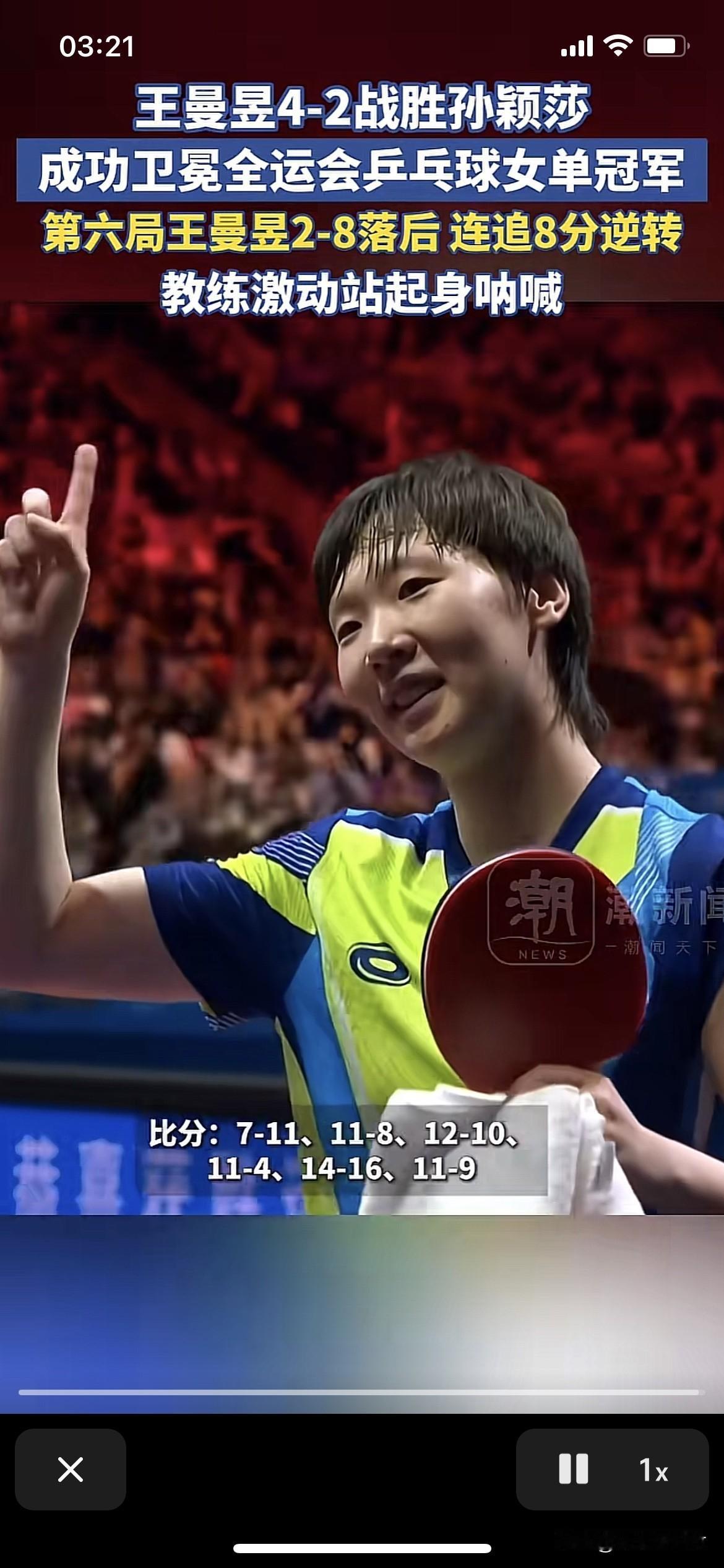 恭喜黑龙江王曼昱卫冕全运会女单冠军 全运会乒乓球女单决赛 王曼昱4:2战胜孙颖莎 第一局孙颖莎11:7战胜王曼昱 第二局王曼昱11:8战胜孙颖莎 第三局双方打到10:10,王曼昱得分11:10,王曼昱局点,王曼昱得分12:10。王曼昱赢下第三局。第三局很关键。 第四局王曼昱11:4轻松赢下孙颖莎。 第五局双方打到10:10,双方得分11:11,双方得分12:12,双方得分13:13,双方得分14:14,孙颖莎得分15:14,孙颖莎局点,孙颖莎得分16:14,孙颖莎艰难赢下第五局。 第六局开局1:7,曼昱落后,双方,王曼昱2:8落后,王曼昱连得8分,10:8,王曼昱赛点。孙颖莎得分10:9,王曼昱得分11:9。王曼昱赢下第六局。 王曼昱4:2战胜孙颖莎获得冠军。 孙颖莎获得亚军。 恭喜黑龙江王曼昱全运会卫冕女单冠军🏆 恭喜王曼昱 ! 恭喜黑龙江[庆祝][庆祝][庆祝] 大鳗鱼今天状态非常好,意志坚定,打的坚决。 给王曼昱打一百分。 第六局王曼昱逆转的是世界排名第一的孙颖莎,王曼昱很强! 决赛王曼昱状态更佳!体能更好!