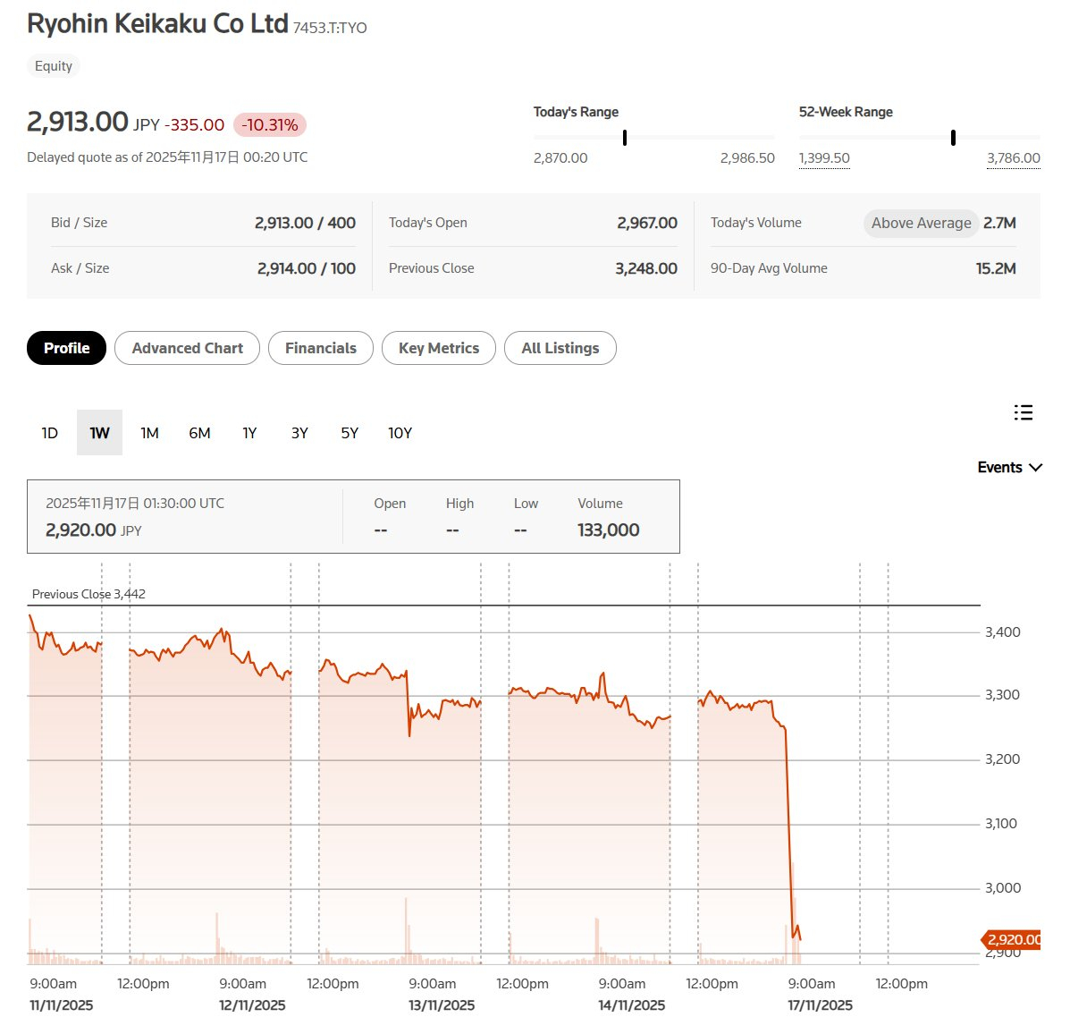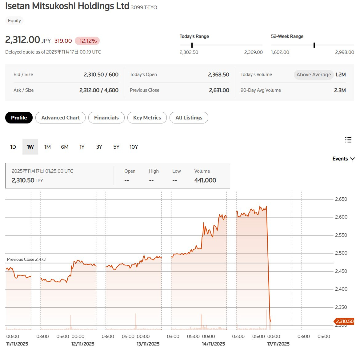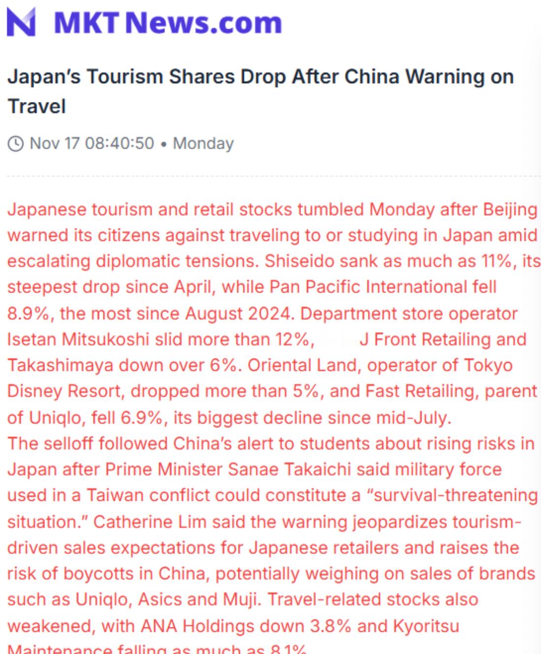 【日本旅游股因中国旅行警告而暴跌,日本外务省亚洲大洋洲局长金井正彰将从11月17日起访问中国(求和?)】 ①NHK:日本外务省亚洲大洋洲局长金井正彰将从11月17日起访问中国,将与中国外交部亚洲司司长刘劲松等人举行会谈。②资生堂股价一度下跌11%,创4月以来最大跌幅,而泛太平洋国际控股下跌8.9%,为2024年8月以来最大跌幅。百货公司运营商伊势丹三越股价下跌超过12%,J Front Retailing和高岛屋股价下跌超过6%。东京迪士尼度假区运营商东方乐园股价下跌超过5%,优衣库母公司迅销下跌6.9%,为7月中旬以来最大跌幅。