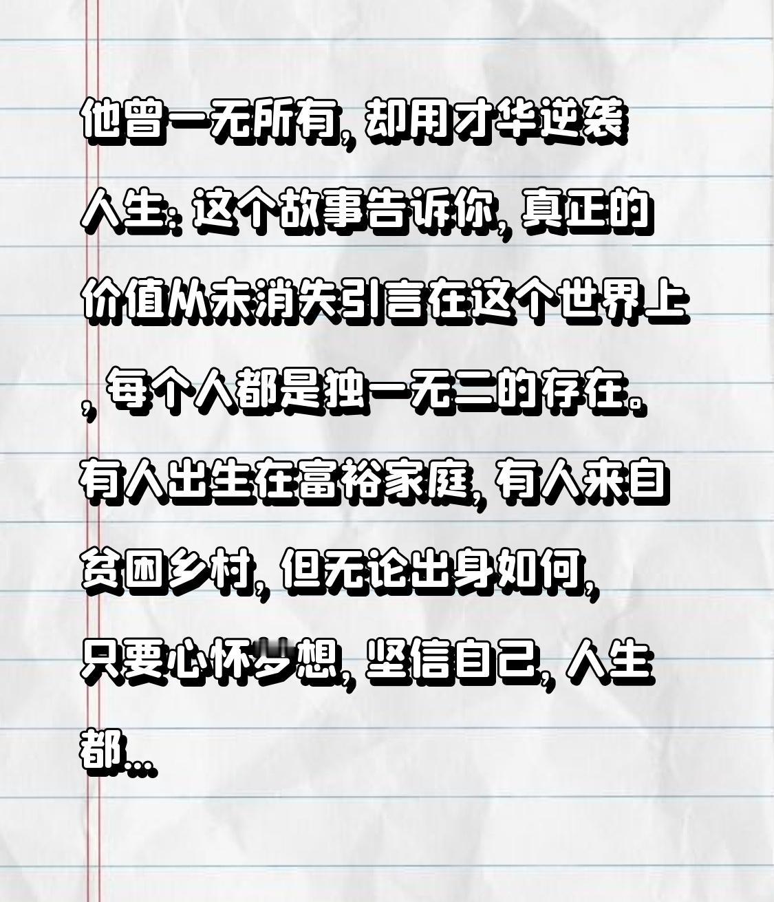 这不仅是一个关于成功的故事,更是一段有关信念、坚韧与自我价值的启示。 一、平凡中的梦想:一个农村男孩的画笔 李明(化名)生于偏远农村,家境颇为贫寒。其父母皆是农民,每日日出而作、日落而息。即便如此,李明自幼便对画画满怀热爱。每到放学后,他总会悄悄拿出破旧画笔,在泥土与纸张上勾勒心中的世界。 村里既无专业美术学校,也无丰富资源支撑他的梦想,但他笃定:只要坚持不懈,终有一日能走出山村,见识更广阔的天地。 他用简陋工具练习,反复钻研每一笔每一色。尽管画技尚显稚嫩,可那份纯粹的热爱让他从未言弃。 二、挫折中的坚持:逆境不改梦想 高中毕业时,李明因条件所限,无法考取大城市的美术学院。家中的经济状况迫使他留在乡村,以卖画为生。每天清晨,他会带着画夹走街串巷,用作品换取微薄收入。 生活的压力与日俱增。一次意外,他的作品遭人盗用、抄袭,损失巨大。这次打击令他陷入迷茫,一度怀疑自己:我是不是天生就没有绘画天赋?我还能坚持下去吗? 但他明白,真正的价值并非取决于他人的认可,而在于自己对梦想的坚守。于是,他暗自下定决心,要用行动证明自己。 三、突破的契机:一次偶然的展览 机遇总是垂青有准备之人。一次村里举办的小型艺术展,李明携自己最满意的作品参展。那幅画虽不完美,却饱含真情实感。 展览当日,一位来自大城市的知名艺术评论家被他的作品吸引,主动与他交流。评论家说:“你的作品极具感染力,充满了生活的力量。希望你能继续努力。” 这句话点燃了李明心中的希望之火。从那天起,他开始参加各类比赛和展览,并逐步在网络上传播自己的作品。 几年后,他的作品被一家著名画廊收藏,他也渐渐走出乡村,迈向更广阔的舞台。 四、用才华逆转命运:成功的故事 如今,李明已成为一位知名画家。他曾一无所有,却凭借坚持与才华,书写了属于自己的辉煌。 他用自身经历告诉我们:每个人都拥有独特天赋,只要坚持挖掘与发挥,即便身处逆境,也能逆转人生。 他的画作在国际展览中展出,斩获众多奖项,也成为众多年轻人心中的励志典范。 五、人生价值的真正含义 李明的故事并非个例。无数普通人用努力证明:人生的价值绝非由外在条件所界定。你的才华与坚持,才是最珍贵的财富。 无论身处何方,无论经历何事,只要心怀梦想、勇敢追求,就必定能迎来属于自己的光明。 他曾一无所有,却以才华逆袭人生,告诉我们:只要相信自己、勇敢前行,人生便会充满无限可能。 六、给你的启示:勇敢追梦,价值永恒 许多人被现实困难打倒,认为自己无路可走。但实际上,人生的价值由内心的热爱与坚持所决定。只要敢于梦想、勇于行动,就没有什么能阻挡你实现梦想的步伐。 就像李明一样,他用画笔描绘未来,也用行动证明:真正的价值从未消逝,只待你去发掘。 结语 人生没有一成不变的命运,唯有不断追求与坚韧不拔的精神。无论你当下处境如何,只要相信自己、敢于梦想,就一定能找到属于自己的天空。 你的价值独一无二、永不褪色。只要坚持,未来就会因你的努力而光彩照人。 记住: 人生的精彩远超想象。你的人生从未被定义,只要敢梦,就能成真。 自我改变命运 底层人逆袭法 普通人逆袭思维