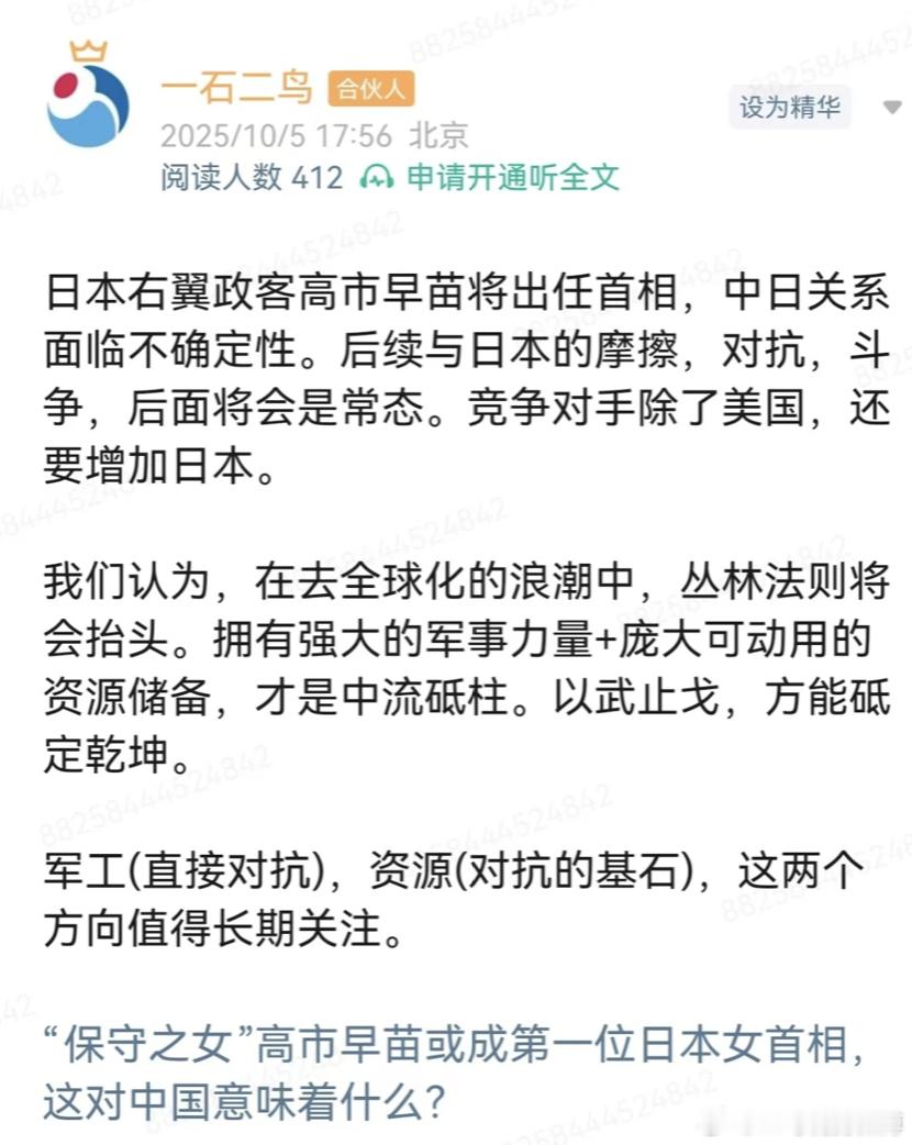 这个女人很麻烦早在高市早苗正式上台之前,我就知道这个女人很麻烦。因为她是一个彻头彻尾的右翼份子。中日关系现在这种状况,完全在我们预期之内。这意味着日本赤膊上阵,后面与日本的斗争、对抗将是常态。竞争对手除了美国,还要加上日本。拿什么教训本子?首先当然是强大的军事力量。之前我们就说过,军工是未来五年可以长期做的方向。其实,还有一点容易被忽视。那就是强大的综合国力,体现为可以调动的资源储备。不仅是战争资源储备,还包括民用资源储备。这是进行对抗的基石。左手军工,右手资源,未来几年吃不了大亏。军工的话,与其他行业还是有一些区别的。一是与基本面的关系不是太大,往往由事件驱动。二是与大盘走势关联度不大,而且经常是逆向波动。大盘涨的时候一般不会同步涨。三是波动比较大,适合波段操作。跌的时候要敢买,涨的时候要舍得卖。