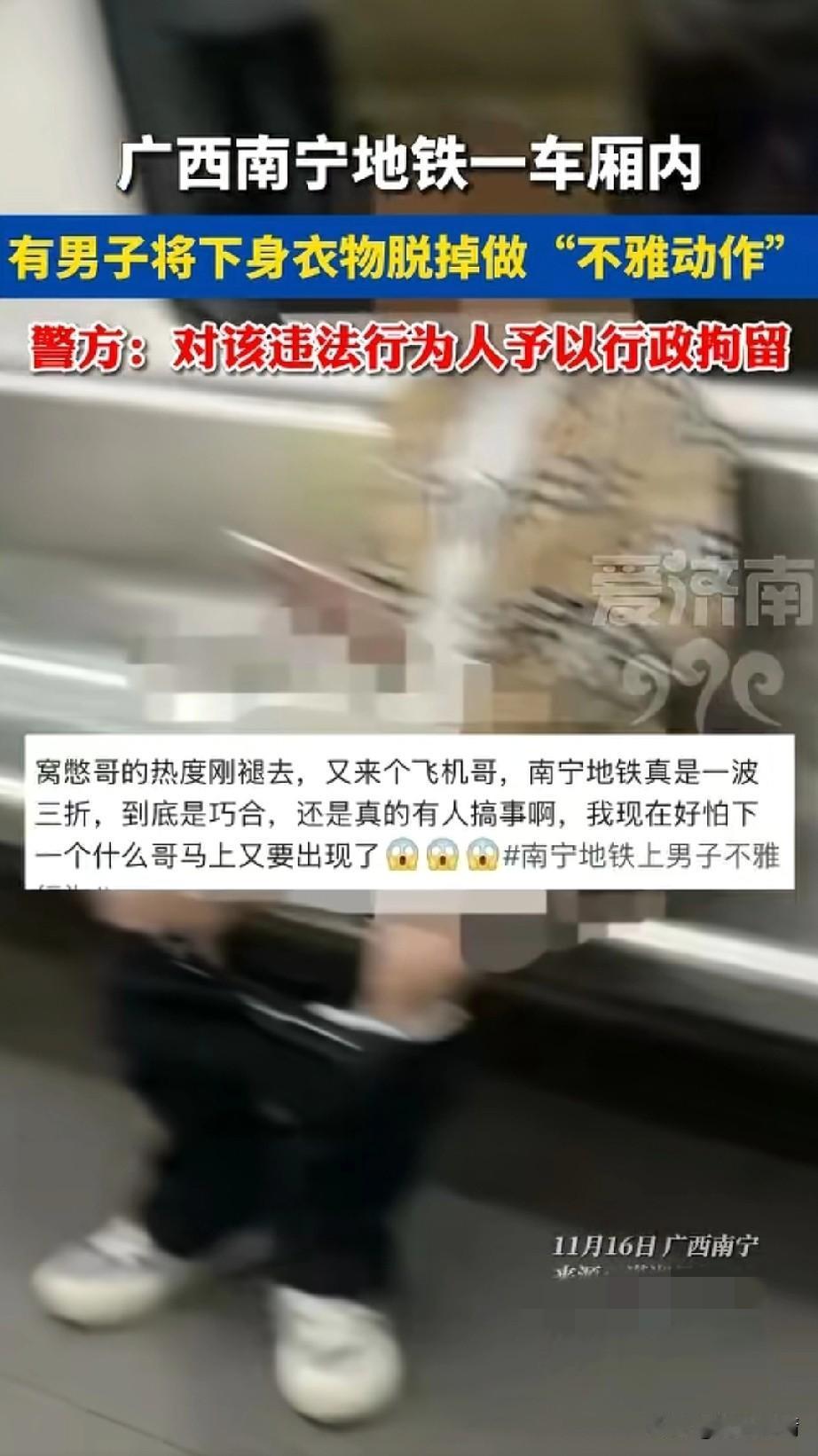 近日广西南宁地铁再次出名, 居然有一名男子在地铁车厢, 脱下裤子做不雅动作, 这可是公共场合, 那么多人居然来这么一出, 实在让人想不明白, 况且万一有小朋友, 后果不可想象, 事情发生在11月15日广西南宁地铁车厢,难怪网友表示刚走了个窝憋哥, 如今又来了个飞机哥, 广西南宁地铁真是一波三折, 是不是有人故意搞事情, 叔叔已经对该名男子给予行政拘留了! 大家对于南宁地铁飞机哥怎么看? 地铁提速生活 南宁爆料 地铁上奇葩行为 地铁小尴尬瞬间 地铁尴尬事情 地铁亲密行为