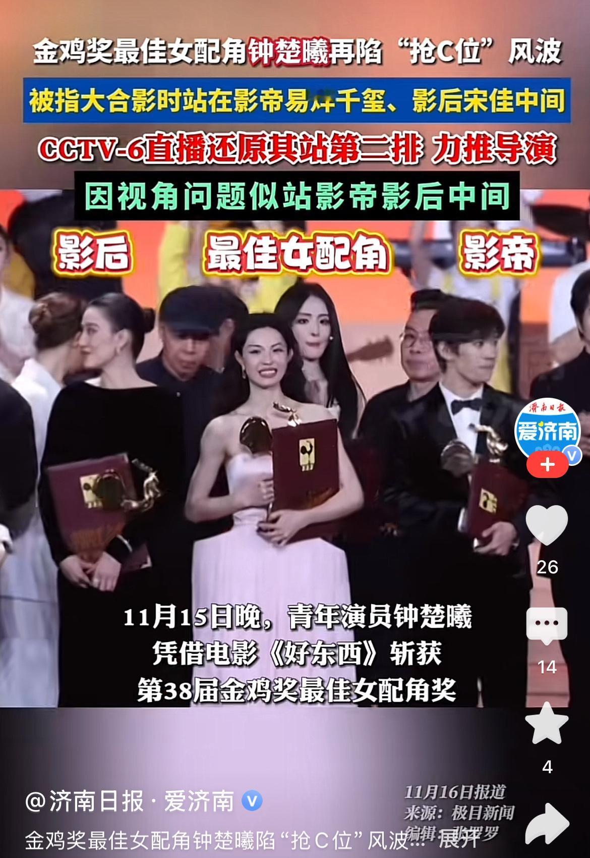 不红是原罪, 红了什么都是对的, 郝蕾这句话的含金量还在上升,尤其刚拿到金鸡奖最佳女配的钟楚曦,又陷抢C风波了! 原来,钟楚曦凭借《好东西》里面的小叶一角,获得了最佳女配后,网友觉得她是飘了,又开始要抢C位了。 在金鸡奖最后大合照的时候看到钟楚曦现在了易烊千玺和宋佳,最佳女主和最佳男主的中间! 网友们这次好像搞错了,央妈都出来澄清了,她其实是站在第二排的,还推旁边的导演靠前站,正好被网友截图产生错位! 所以钟楚曦到底还是不够红,实力不够,引起的一系列连锁反应,大家对她已经有了抢占C位的滤镜了! 她要想突破自己还是得提高实力演技!得到认可!大家说呢?