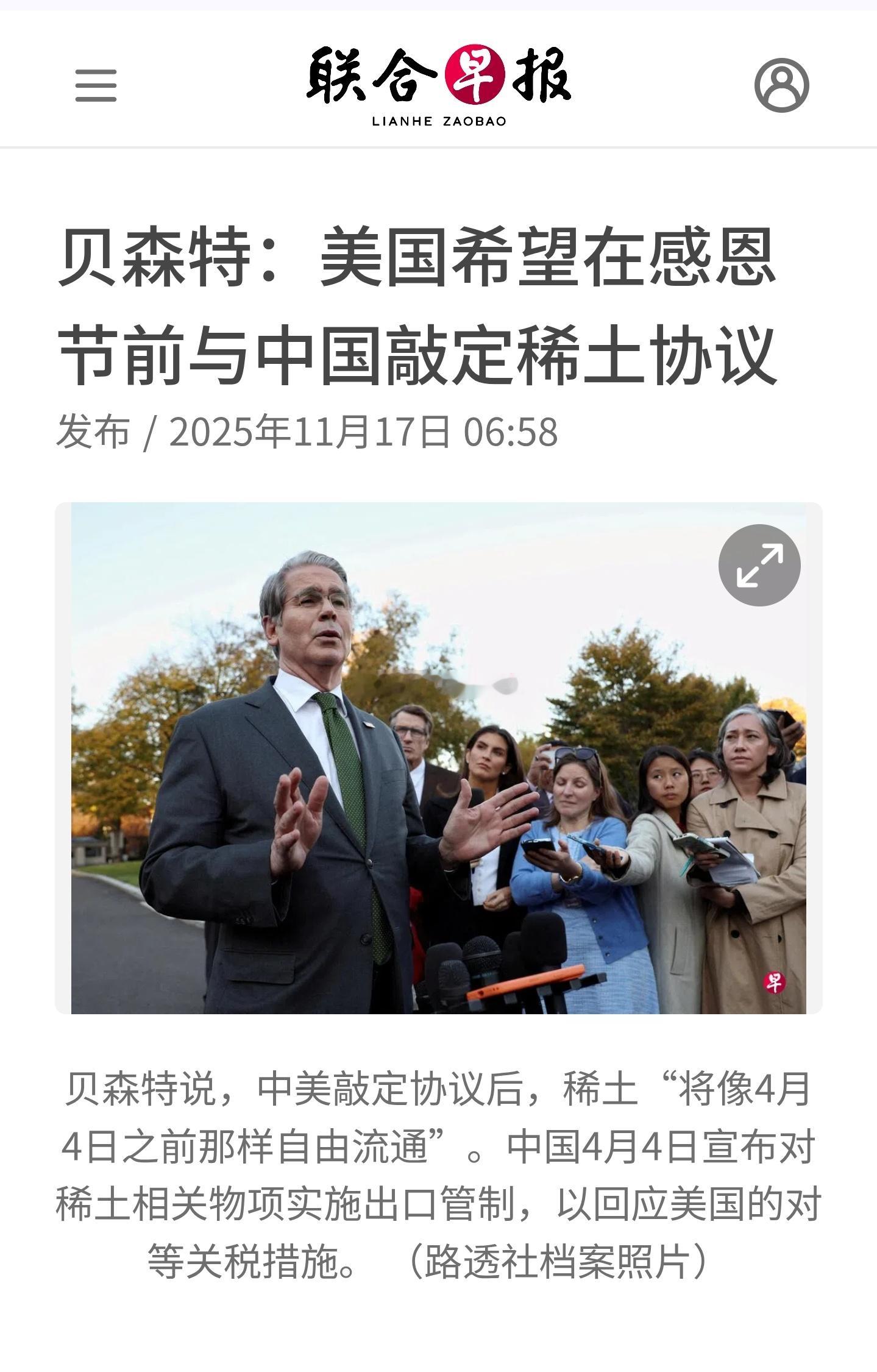 美国财政部长贝森特在星期天(11月16日)播出的福克斯新闻节目中说:“我们还未敲定(稀土)最终协议,希望能在感恩节之前敲定”。美国感恩节是每年11月第四个星期四,今年的美国感恩节在11月27日。根据美国和中国上月底达成的一项框架协议,华盛顿同意不对中国进口商品征收100%的关税,中国则同意暂停对关键稀土矿物和磁铁实施出口管制一年。