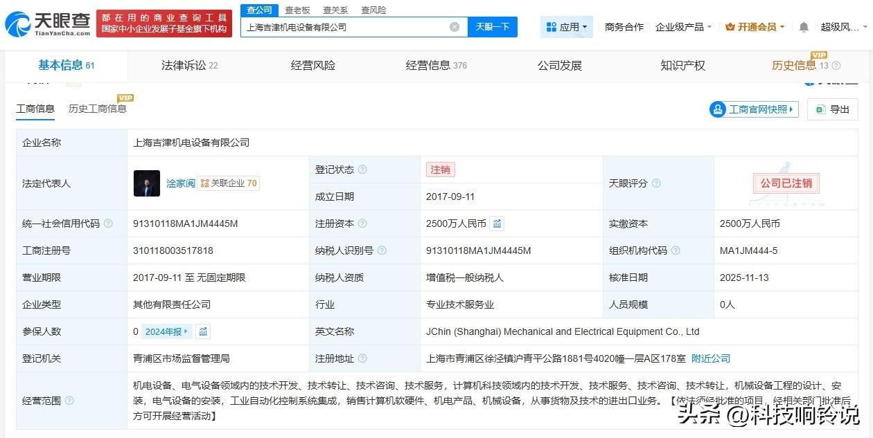 【吉利旗下上海吉津机电设备公司注销】 天眼查App显示,近日,上海吉津机电设备有限公司登记状态由存续变更为注销。 该公司成立于2017年9月,法定代表人为淦家阅,注册资本2500万人民币,经营范围包括机电设备、电气设备领域内的技术开发、技术转让、技术咨询、技术服务等。股东信息显示,该公司由浙江济底科技有限公司、浙江吉利汽车零部件采购有限公司共同持股。 天眼查信息: