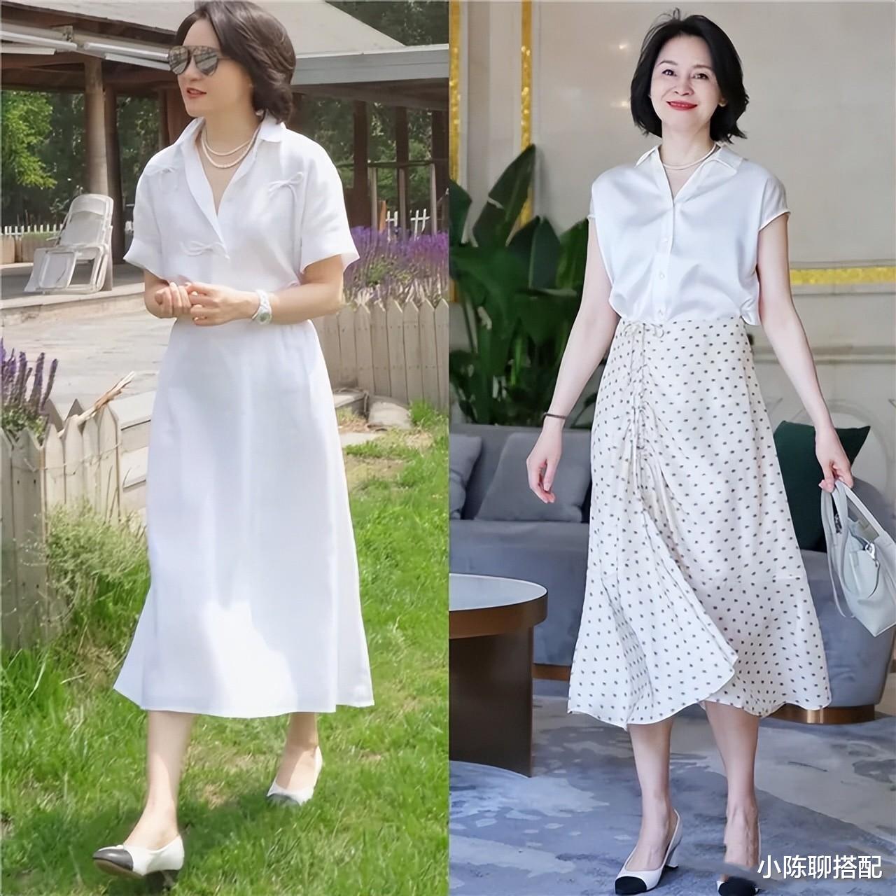 看50+的黄绮珊,以前选择色彩浓烈、图案花哨的服装,看似时髦却显老土油腻;而现在选择的款式简洁的浅色服装,看着舒适显年轻也气质大方:
