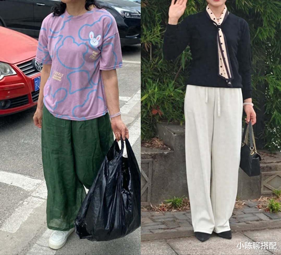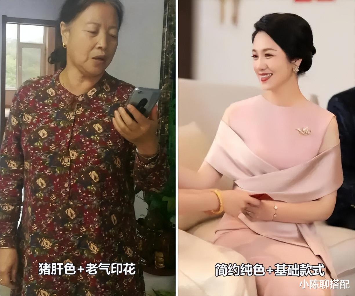 比如说颜色杂乱、不清爽的印花或者面料,典型的便是猪肝色+老气印花的单品,看似符合年龄,实则会显得臃肿拖沓。看这一组对比就很明显,左边这一身让整个形象显得拖沓、不精神,与时尚完全无关;有右边这一身看着简约,却有精心打理过的精致感。
