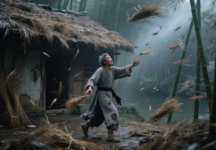 那年秋风似刀,狠狠撕扯着杜甫在成都浣花溪畔勉强安身的茅屋。屋顶多年茅草本已脆弱不堪,狂风过处,一层接一层被粗暴卷起。诗人追着漫天飞舞的茅草,踉跄穿过竹林,狼狈不堪。 南村那群熊孩子当面欺负他年老无力,抱着茅草一头扎进竹林深处,任他焦灼呼喊也装作听不见。秋风灌满他单薄破旧的衣袖,寒意刺骨,更痛的是这世道人心。