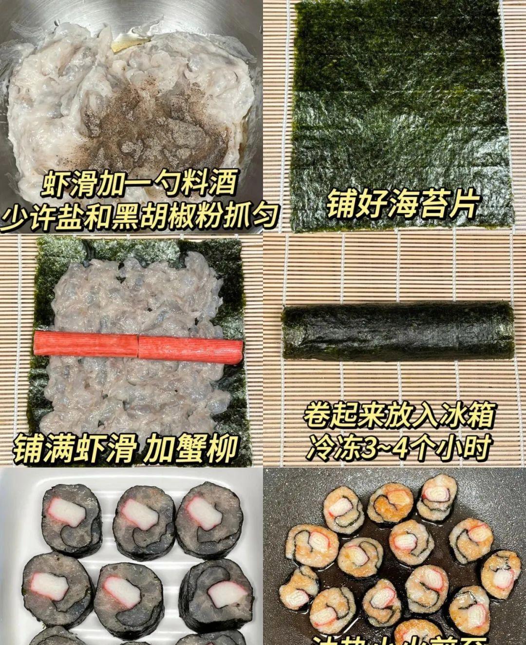 我猜这道菜的做法应该是先把虾滑做好,然后用海苔包起来,最后可能还要煎一下或者烤一下。这样外面的海苔就会变脆,里面的虾滑还是嫩嫩的,口感应该很丰富。不过我觉得这个做起来可能有点难,尤其是包的时候,估计很容易散开。