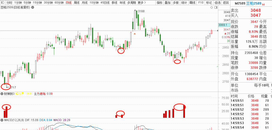 今天油脂板块整体下挫,油料却还很坚挺,事出反常必有妖,这种时候一定不要去赌油脂反弹或者赌油料下跌,按照自己的方法节奏来。在自己理解的范围内找到市场中的某些运行规律,利用规律来盈利。