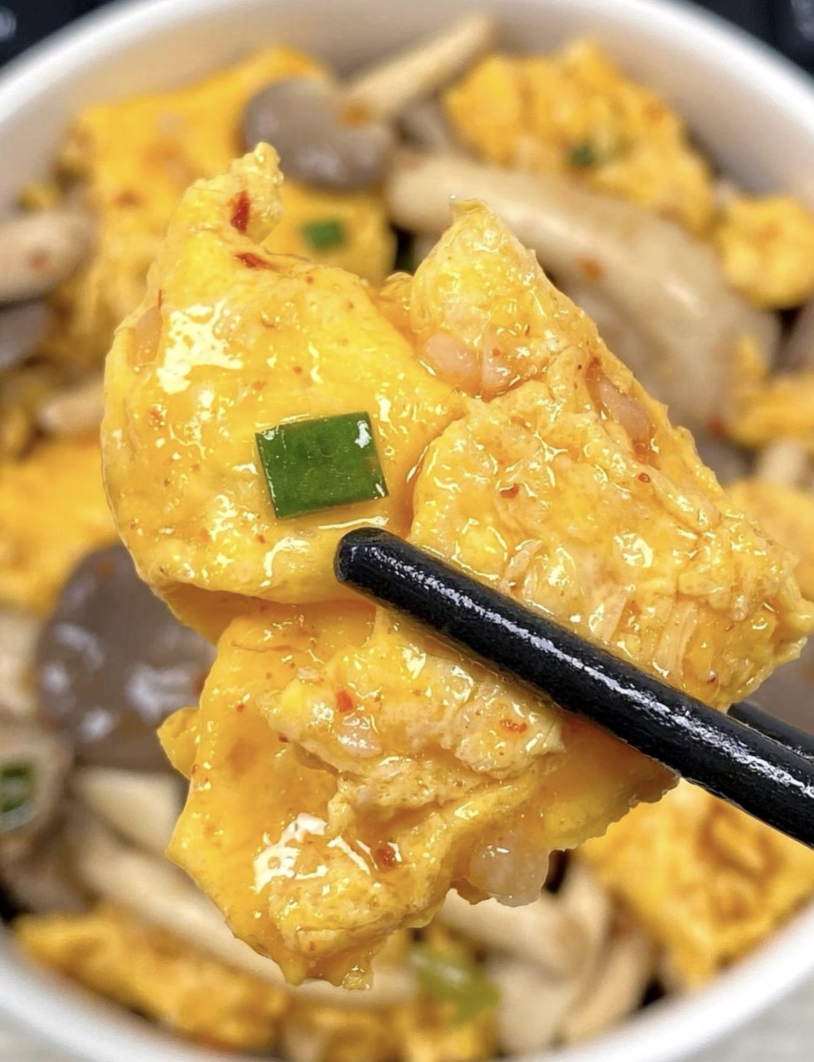 装盘也有仪式感:我妈用深口瓷盘,先把蛋和菇堆成小山,再用筷子轻轻压一道小沟,让热气顺着“山谷”往上冒,吃之前先闻香,口水已经“自动分泌模式”。第一口必须配米饭!蛋液裹着米饭,像给每粒米穿了一件黄金羽绒服,平菇脆弹,偶尔咬到焦香的边缘,“咔嚓”一声,像彩蛋。我妹总嫌不够,把盘子刮得吱呀响,我妈就笑:“盘子都要啃了,下次给你双份!”