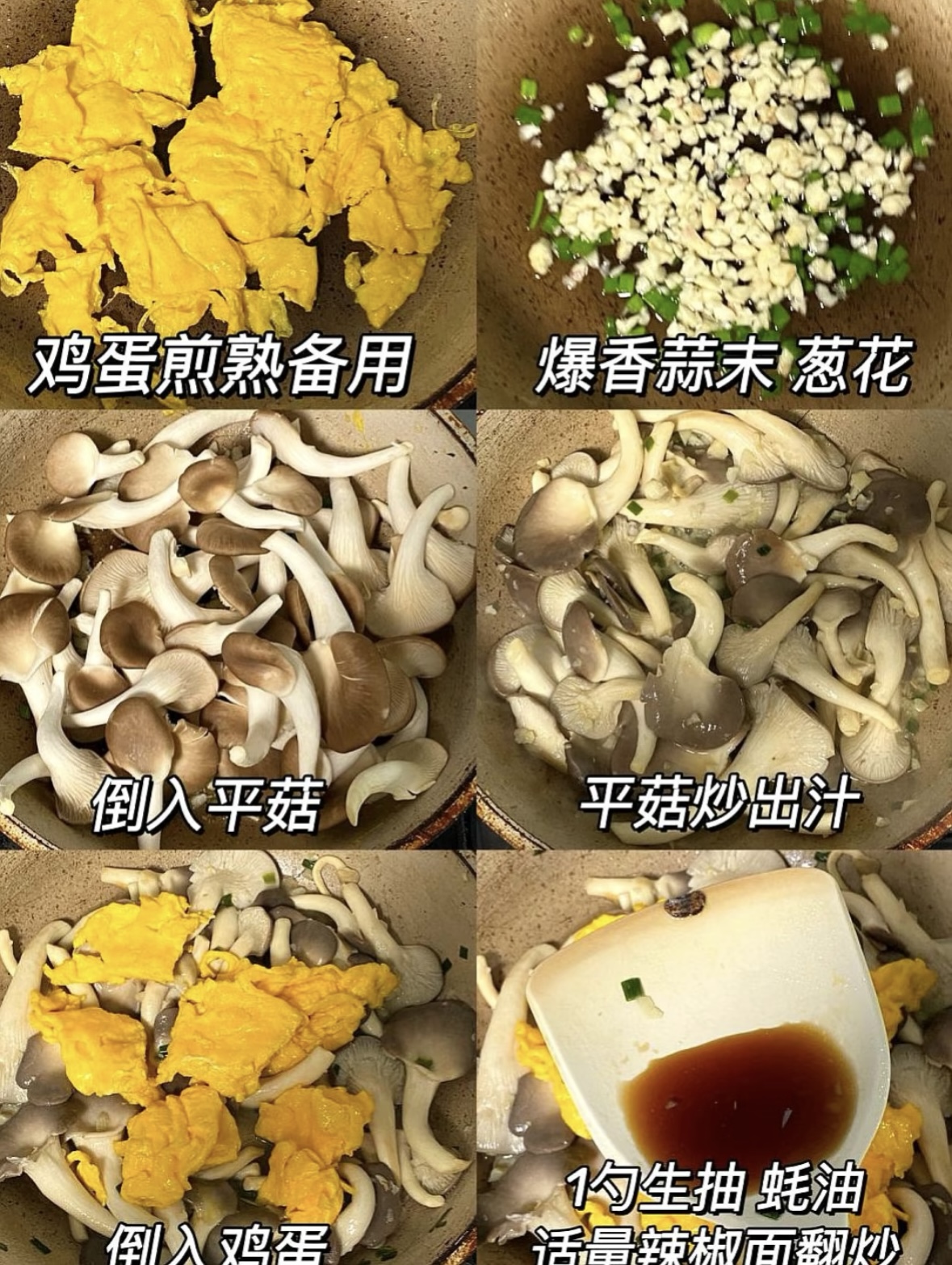 锅烧热,倒油前先拿姜片蹭一圈,这是老铁锅的“开机仪式”,防粘还增香。油不是一次倒够,而是分两回:第一次油温五成热,下平菇,让每片小伞都裹上油衣,中火慢煸到微微出水,边缘泛起金黄小焦边——这时候的平菇,鲜味浓度爆表,像被阳光晒过的海带,自带“味精”光环。把菇扒拉到锅边,中心留空,第二次补少许油,油温升高到七成热,“哗”地倒入蛋液。只听“呲啦”一声,蛋液迅速膨胀,边缘泛起蕾丝裙边,我妈拿着锅铲,手腕轻轻一抖,蛋液像金黄的云朵把平菇包进怀里,蛋香、菌香、葱香三合一,香得我直接原地转圈。