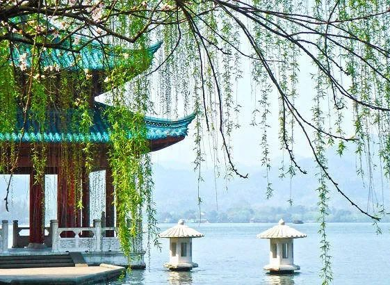 亭柱上的楹联所曰:“翠柳翻晴空莺穿树色千重翠,光风拂烟水棹举鳞波万点光”(棹:zhào)。此联甚巧,属佳联,上下联的首尾均嵌入翠光二字,是谓鹤顶格和雁足格,巧妙地点出了此亭在湖光山色与翠柳依依间,为西湖更添无限雍容气韵。联中“千重翠”取自白居易《春题湖上》:松排山面千重翠,月点波心一颗珠。