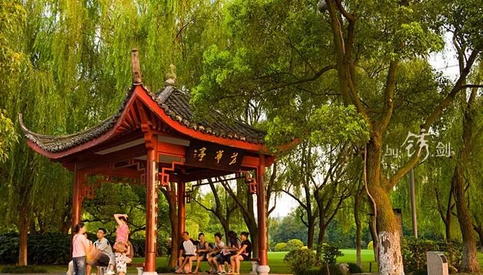 移步换景,东侧又有一亭,名曰“芳华亭”,匾额描金,楹联敷绿,楹联为:“湖镜映天湖有月,柳荫垂地柳藏莺”。此亭原来置有“柳浪闻莺”碑刻,现在碑刻移位至钱王祠西北侧,空余芳华在原地,供游客路经休息。周日经常有六七个老人,在亭里免费为游客画像。
