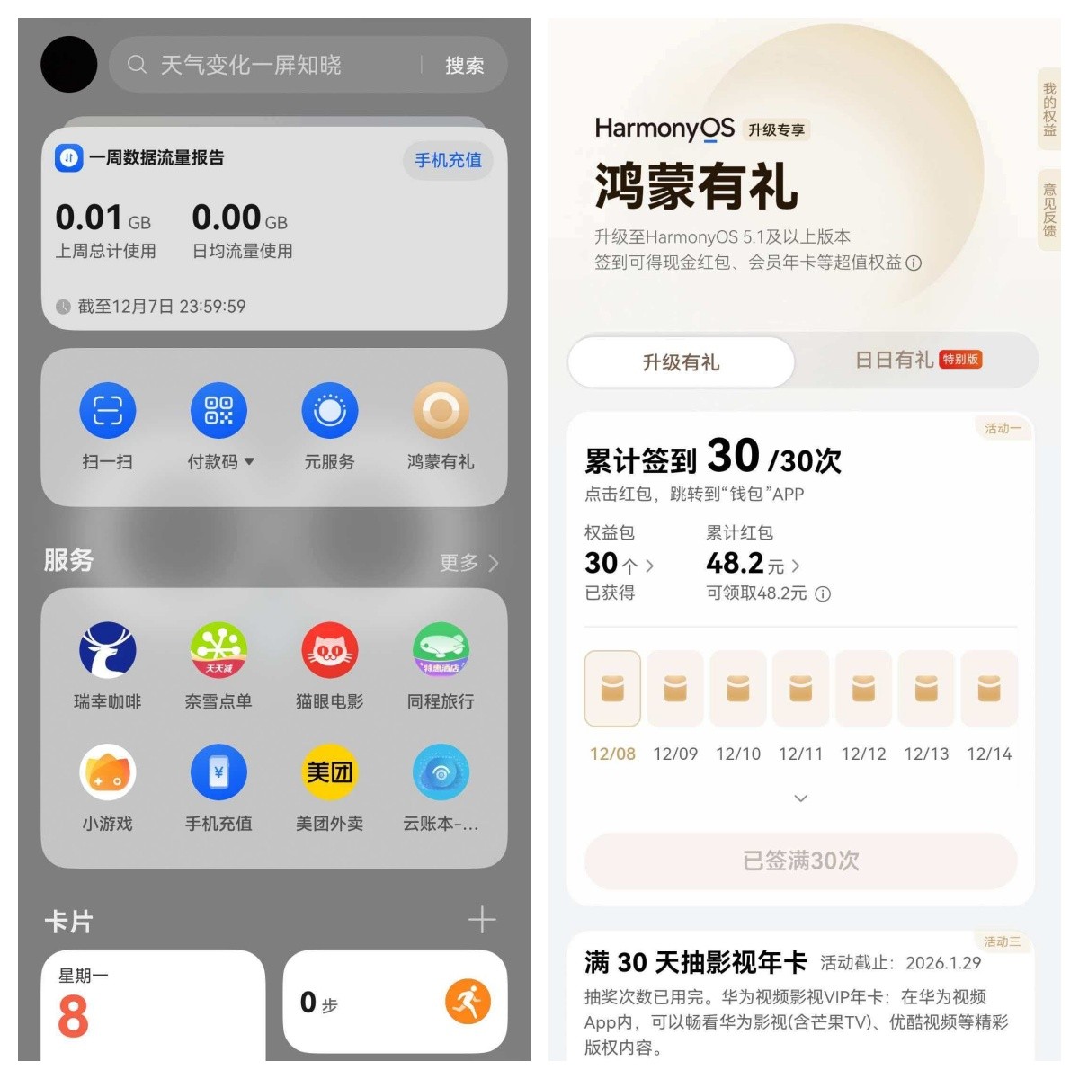 想领福利的朋友看这里,操作非常简单,手机桌面右滑进入负一屏,找到“鸿蒙有礼”点击进入,每天签到就行。除了心心念念的年卡免单抽奖,大家还可以每天顺手签到领奖,也能领个红包或者小权益;签到第30天除了八大热门应用会员年卡,还有影视年卡机会抽取华为影视年卡VIP年卡礼包,能在华为视频端内畅看华为影视(含芒果TV)、优酷视频的所有视频,立省一顿大餐钱。