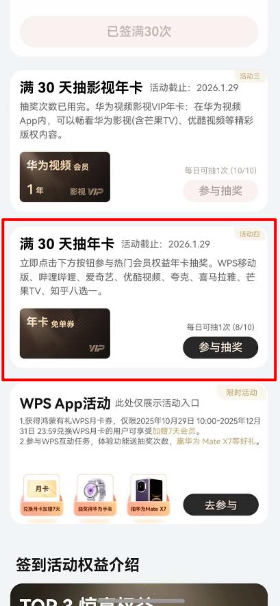 在这个活动中,首次签到第30天后能解锁的满30天抽年卡,简直就是为我们这种干饭追剧党量身定做的,活动的奖品是热门应用年卡免单券!能兑换的热门应用里,不仅有我正急需的爱奇艺年卡,还有哔哩哔哩、芒果TV等另外七大热门应用年卡,可从中八选一,这福利力度确实让人很难不心动。我就是签到满30天后好在我之前随手签了一个,抽中了年卡果断兑换了爱奇艺会员,成功实现一整年的“电子榨菜”自由了!